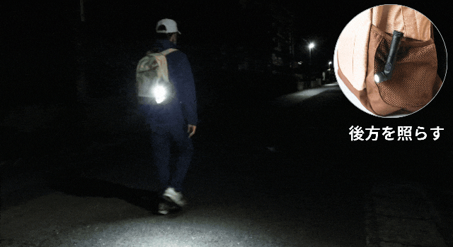 ヘッドを回転させてバックパックのポケットに装着すれば、後方を照らすことができる。