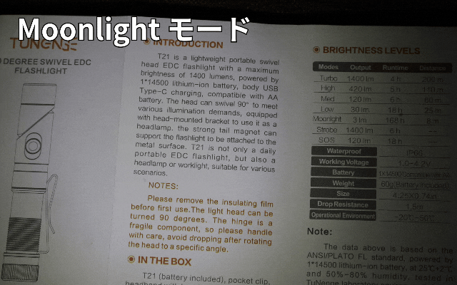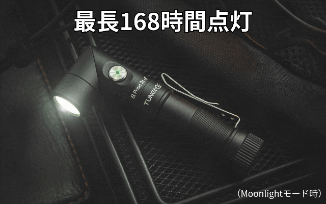 Moonlight(ムーンライト)モードは、手元で小さな明かりがほしいときに(3ルーメン)。