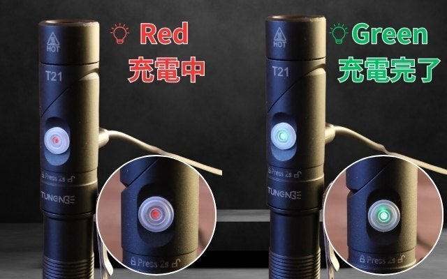 充電中は赤色が点灯、充電完了は緑色に変わるのでわかりやすい。