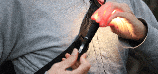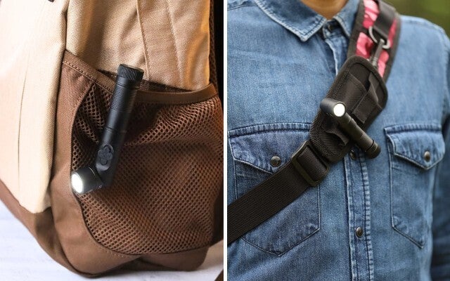 ショルダー紐に装着すれば、手に持たなくても前方を照らすことができる。