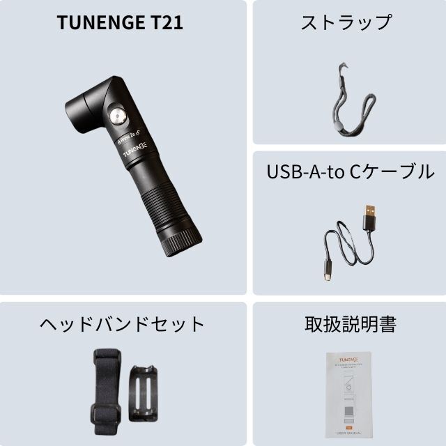 内容:T21 懐中電灯本体、14500充電池(搭載)、USBケーブル(TypeA to C)、調節ストラップ、ヘッドバンドセット、取扱説明書(日本語)