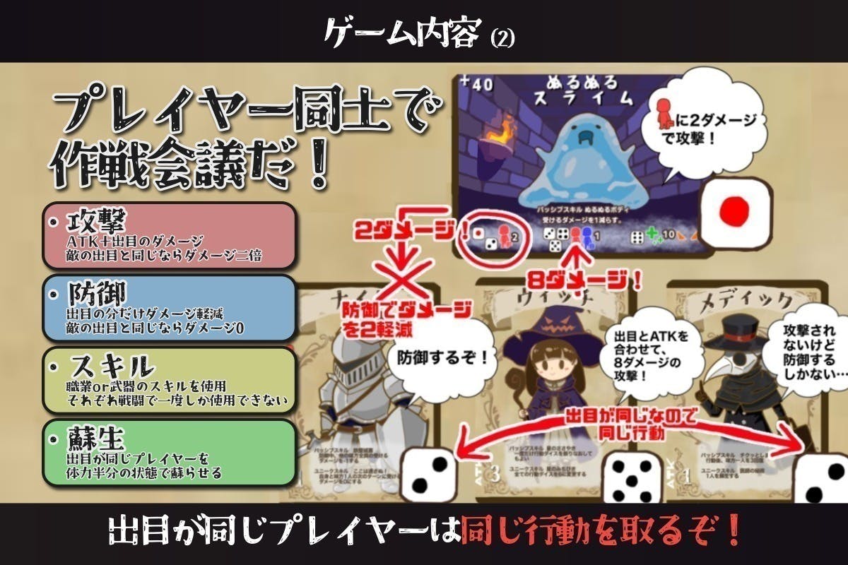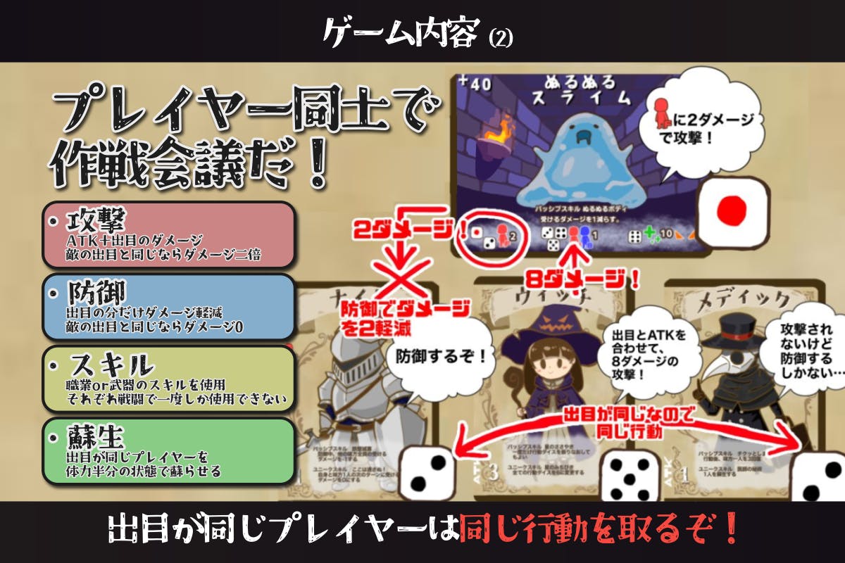 「みんなでRPGをやるボードゲーム、欲しいよな」 という発想から生まれた本作。サークルとしては初の作品となりますが、システムの完成度とRPGに対する想いには自信があります。また、RPGならではの 「少しずつ強くなっていく感覚」 と、ボードゲームならではの 「ダイスによるクリティカル」 をうまく融合させた作品に仕上がりました。