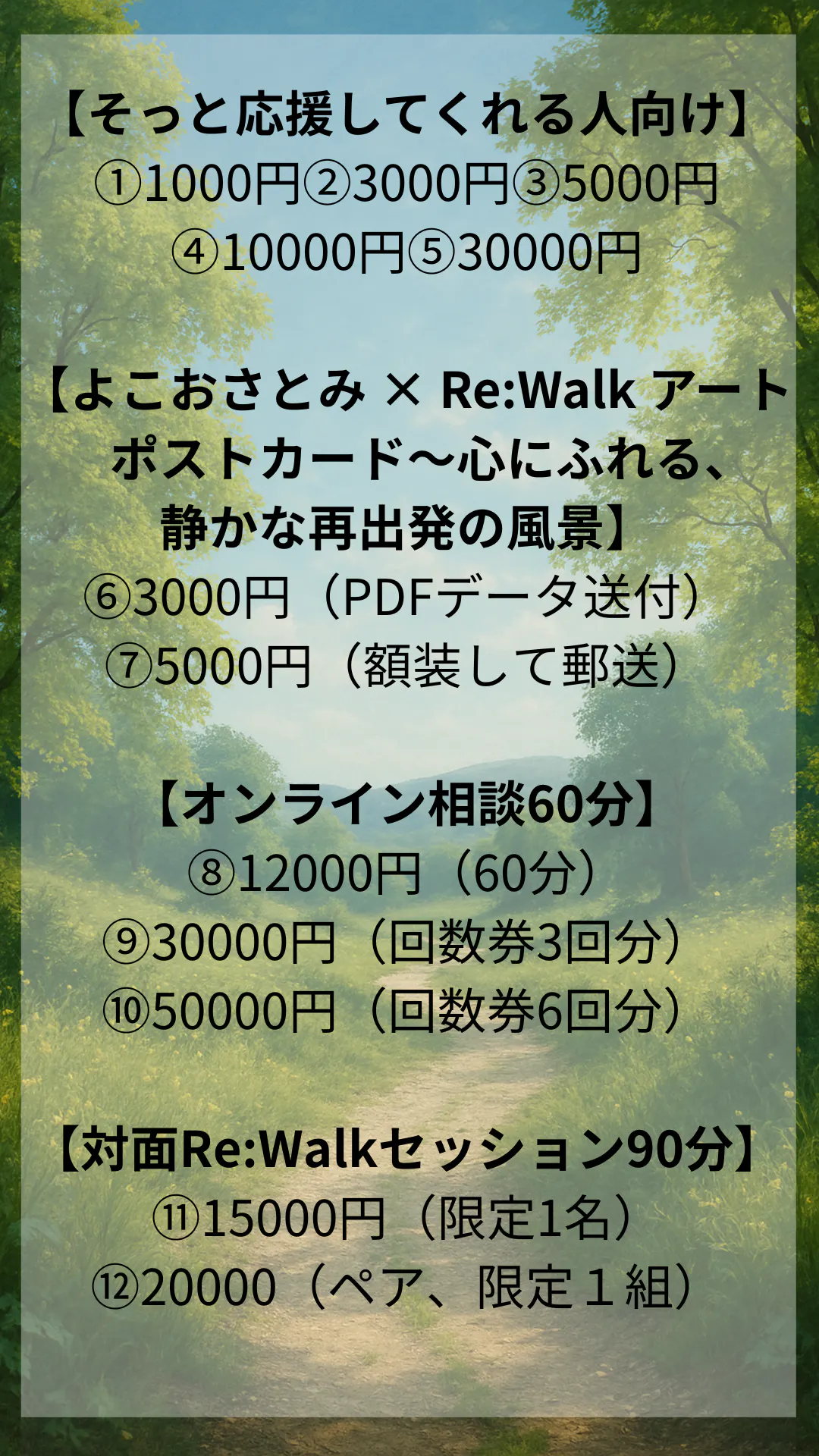 社会を支える責任世代と、来世代の負担を少しでも軽くしたい。Re:Walkは、がんばりすぎて心が疲れてしまった人が、自分らしさを取り戻し、また歩き出すための「心と体を整えるサポート」です。あなたの応援が、誰かを後押しします。どうぞよろしくお願いいたします。