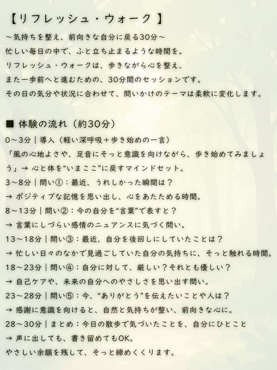 心の中に溜まった重たい感情や、手放したい思考を見つめながら、静かな問いかけと自然のリズムに身をゆだねていきます。「今の自分を受け入れる」ことから始まり、「これからどう生きたいか」へ。歩きながら心を整え、あらたな一歩を踏み出す準備をしていく時間です。