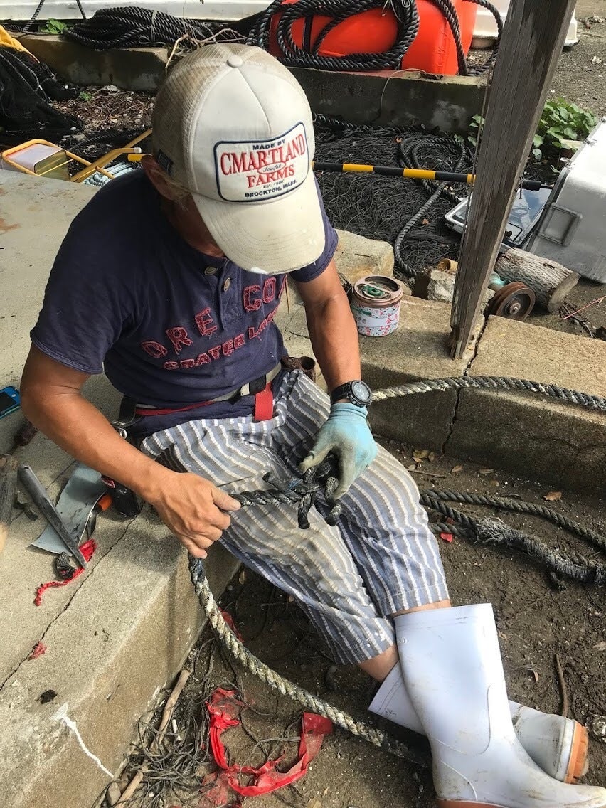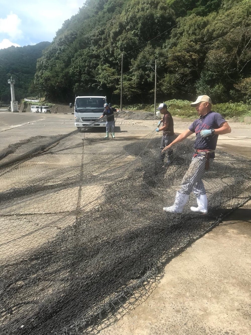 西の浜では復旧作業を進めています。今日は錨に使用するビクや、登り網、運動場の網の仕立て準備を行っています。地元の方からもアドバイスをいただきながら自分たちで修繕。持続可能なモデルになるよう、1つ1つ取り組んでいきます。