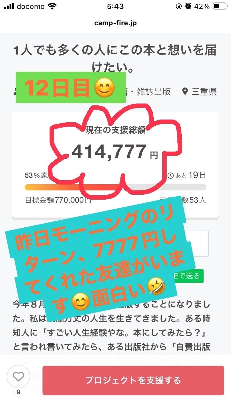 昨日、遠い友達が7,777円支援してくれました。モーニングに7777円。広島の友達です。本来伊勢まで来てもらうのだけど…たまたま10月広島行くことになったから申し込んでくれた。広島のコメダの店長です。こんな展開も面白いね