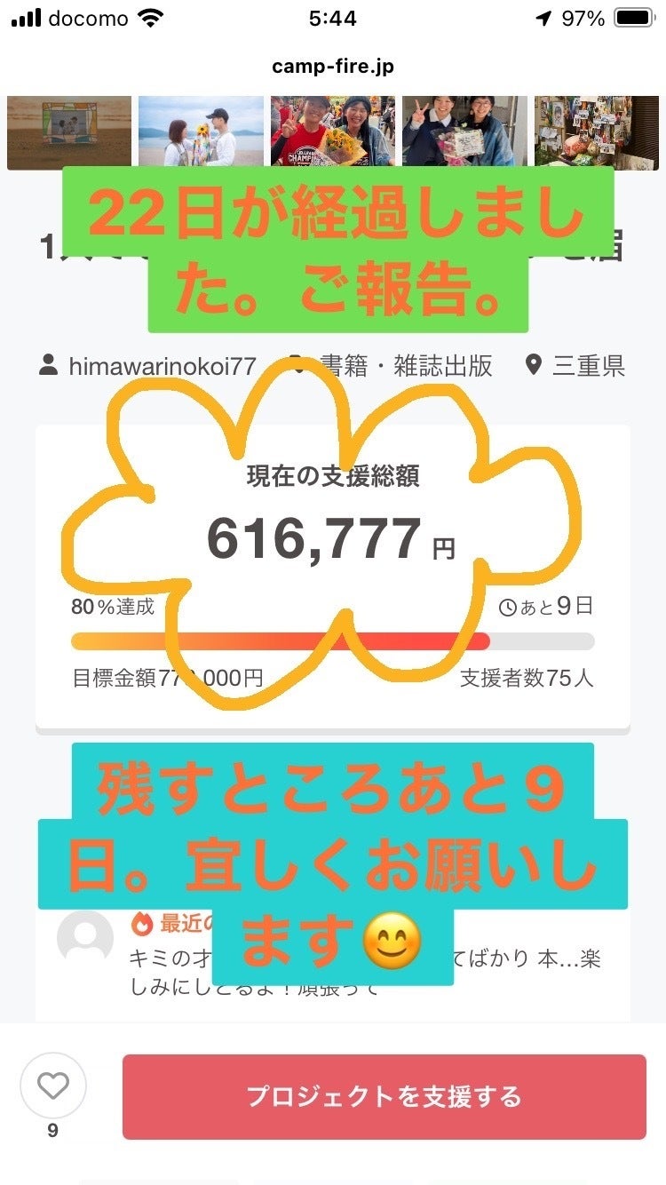 現在75人の支援者にこのプロジェクトにご参加いただきました。ありがとうございます。