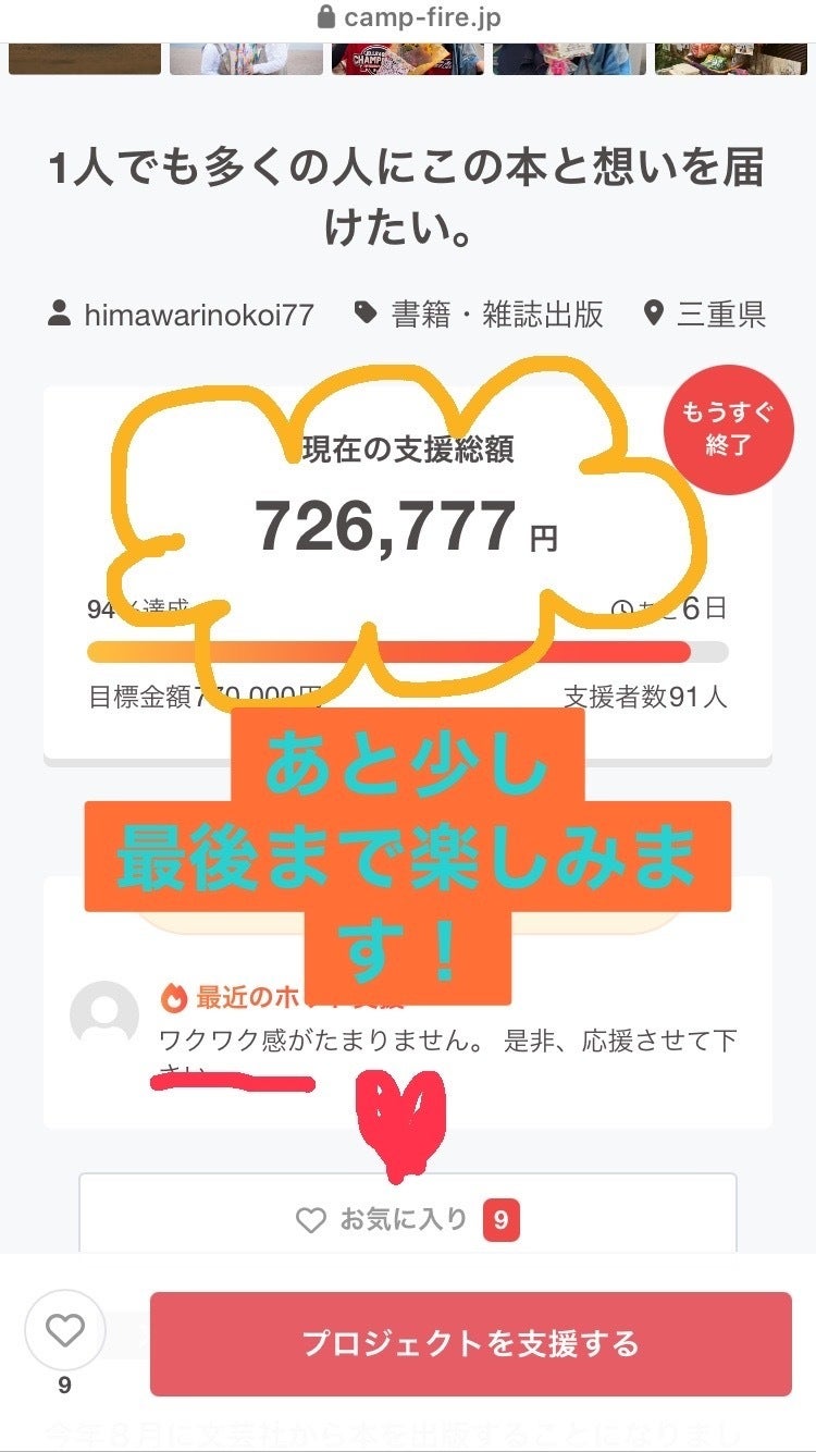 たくさんのご支援ありがとうございます。目標金額まであと少し。お気持ちに感謝します!