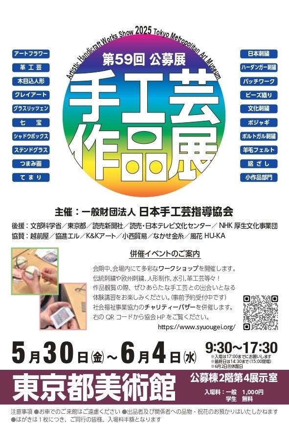 5月30日~6月4日、東京上野の東京都美術館にて「第59回手工芸作品展」を開催します。(6/2月曜は休館日です)