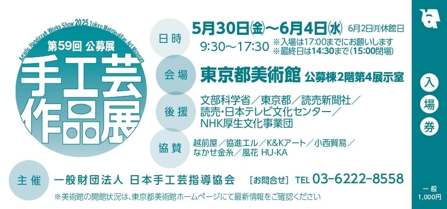 5月30日~6月4日、東京上野の東京都美術館にて「第59回手工芸作品展」を開催します。(6/2月曜は休館日です)