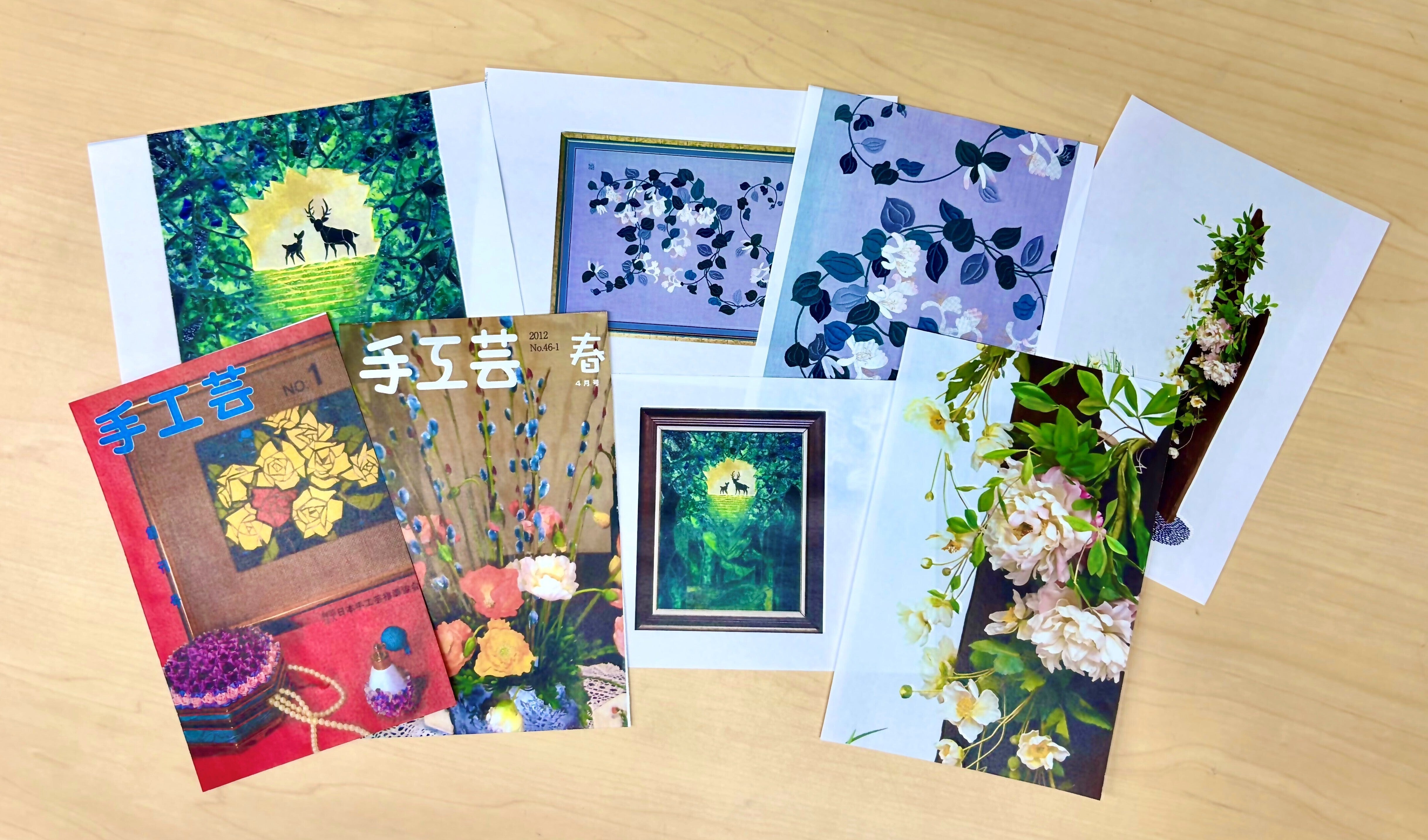 広報誌手工芸の創刊号を含む表紙数枚と第59回作品展の特別出品(手工芸歴20年以上の指導者の作品)の写真(プロカメラマン撮影)をポストカードにし、会期終了後(2025.8月予定)にお送りします。