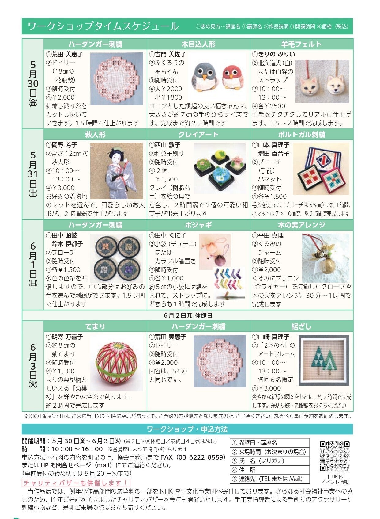作品展開催に向け、3月1日より応募受付を開始しました。4月10日の締切りまで、HPやSNSで応募を呼びかけてまいります。また、ここ数年の作品展では「新しい手工芸との出会い」の場をご提供できるように、会場内にてワークショップ(体験講習会…上記一覧)を併催し、ご好評をいただきました。今年も会期中日替わりで、11科目(伝統刺繍や欧州刺繍・てまり・クレイアート・羊毛フェルトなど)のワークショップを併催予定です。