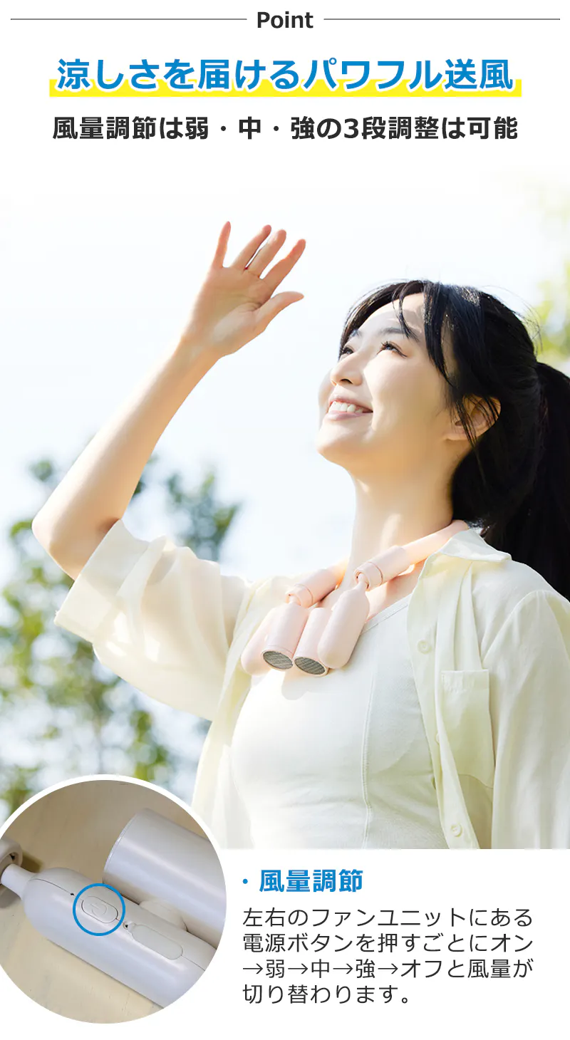 回転調整可能なファンユニットを搭載し、風向きを自由に調整可能!首元はもちろん、顔や肩まわりなど、涼しくしたいところにピンポイントで風を当てられます。さらに、3段階の風量調節機能付きで、シーンや気温に合わせて快適な風量を選択可能!