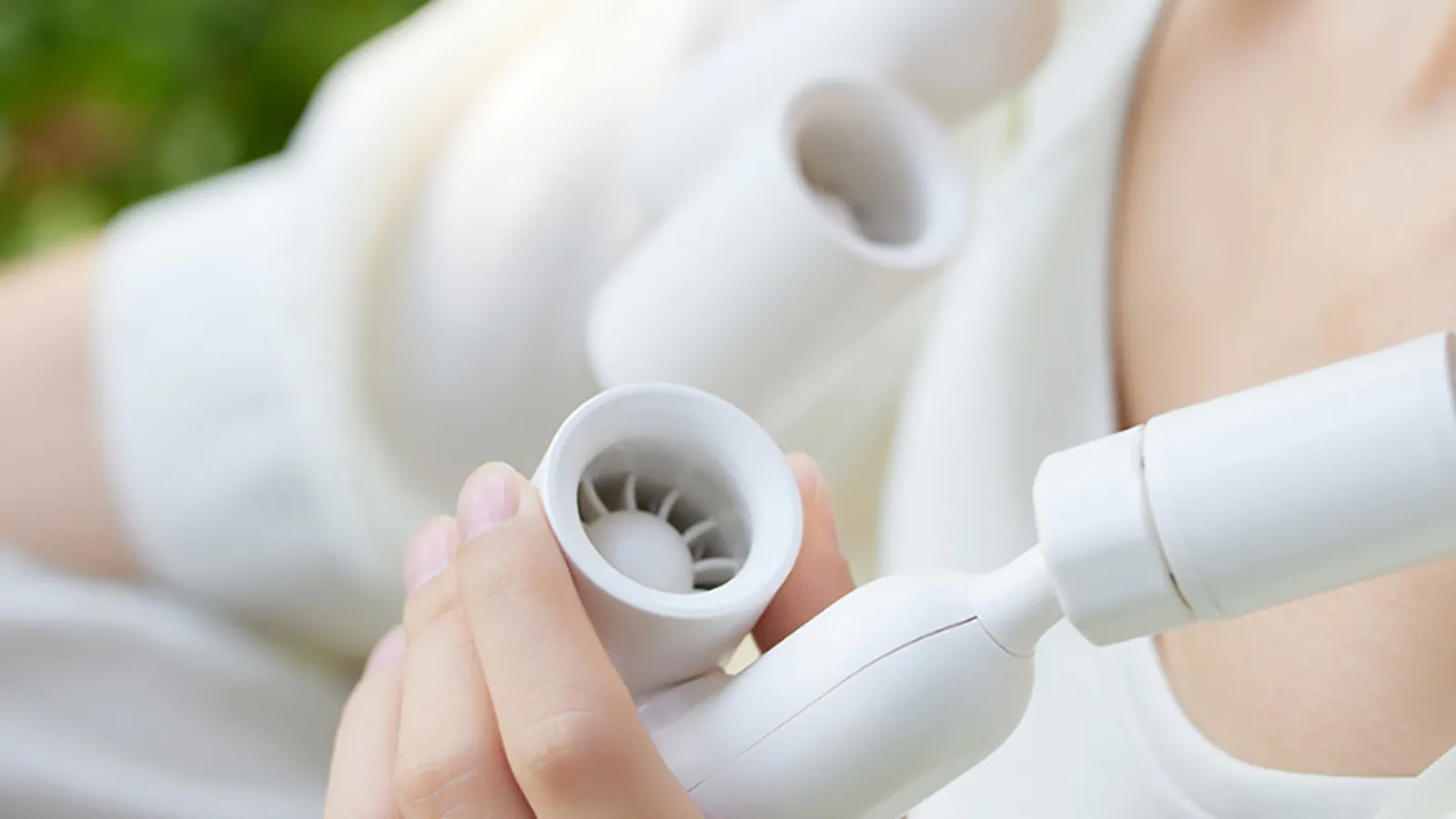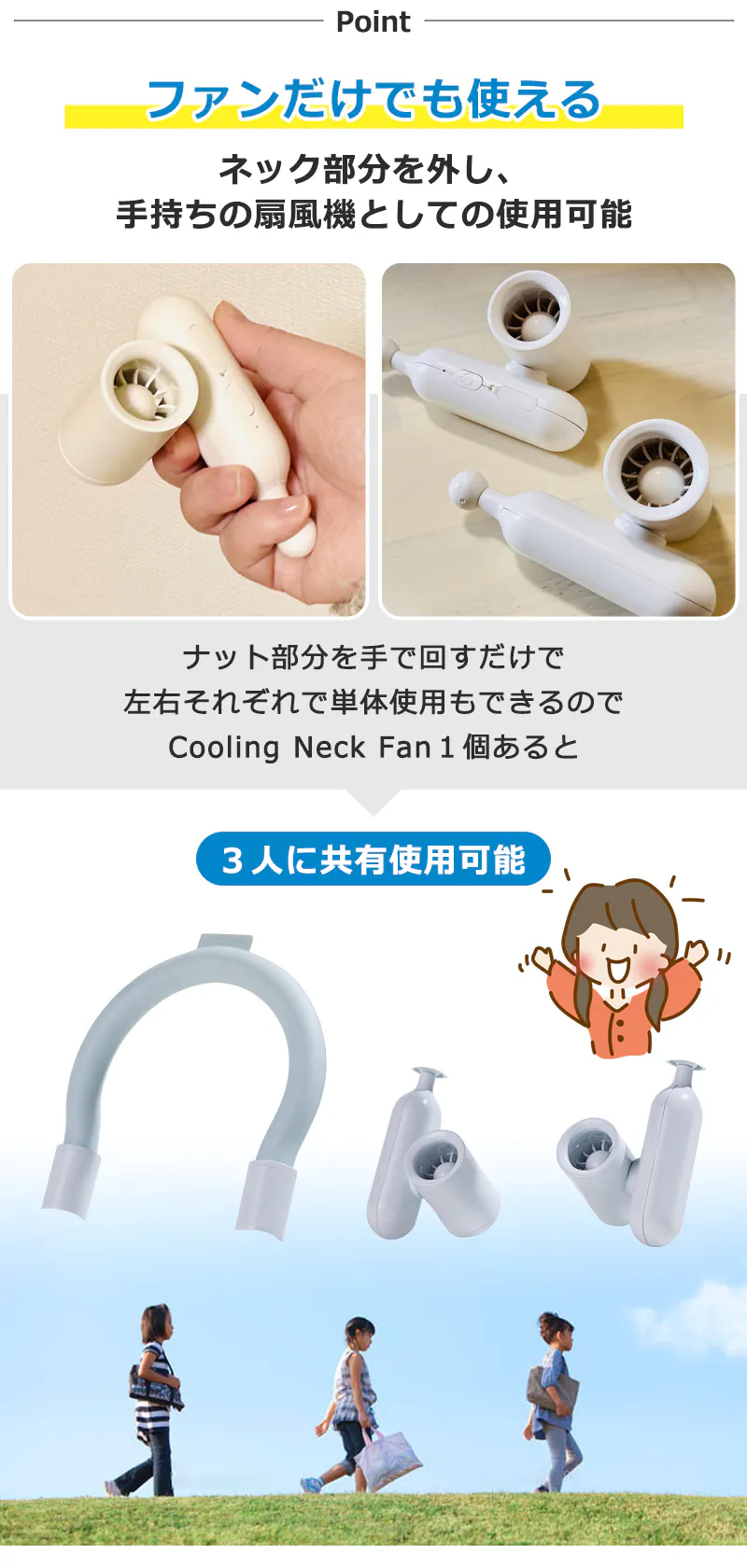 ナット部分を手で回すだけで取り外し可能。左右のファンは単体でも使えるから、2人でシェアして手に持ちながら涼んだり、もう一人はネックリングで首回りを冷やしたりと、使い方は自由自在!
