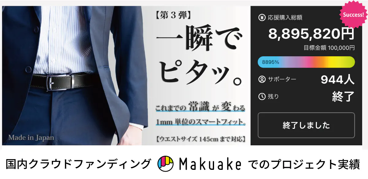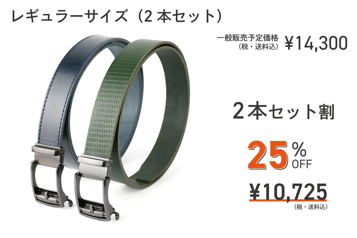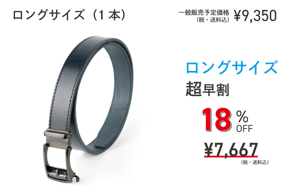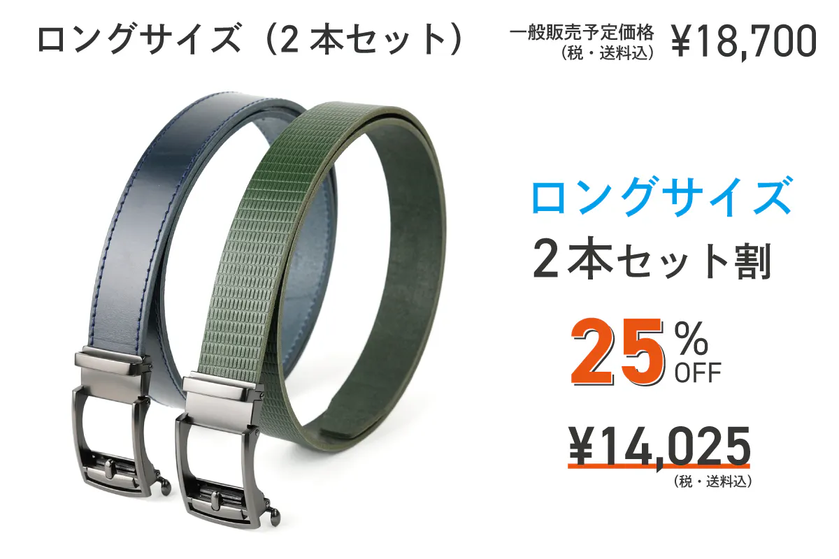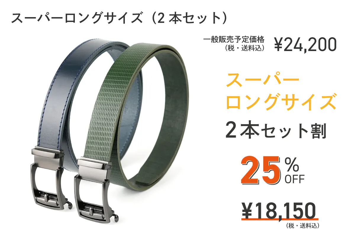 これまでのロングサイズは、ウエストサイズが105cmまでの対応でしたが、「もっと長いベルトはないですか?」「115cmまで対応サイズを作ってほしい」などお声をいただいておりました。メーカーとして、お客様の声にはできる限り応えたい、そしてより多くの方にベルトを楽しんでもらいたい思いから、本プロジェクトでは「ロングサイズ:115cm対応」「スーパーロング:145cm対応」と従来よりも長いベルトをご用意しました!