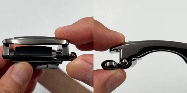 バックルはワンタッチレバーを押すとベルトがスライドする口が開きます。開いている間にベルトをスライドすることにより微調整をすることが可能となります。レバーパーツに黒の樹脂パーツ見えると思います。このパーツがベルトをガッチリと固定してくれます。