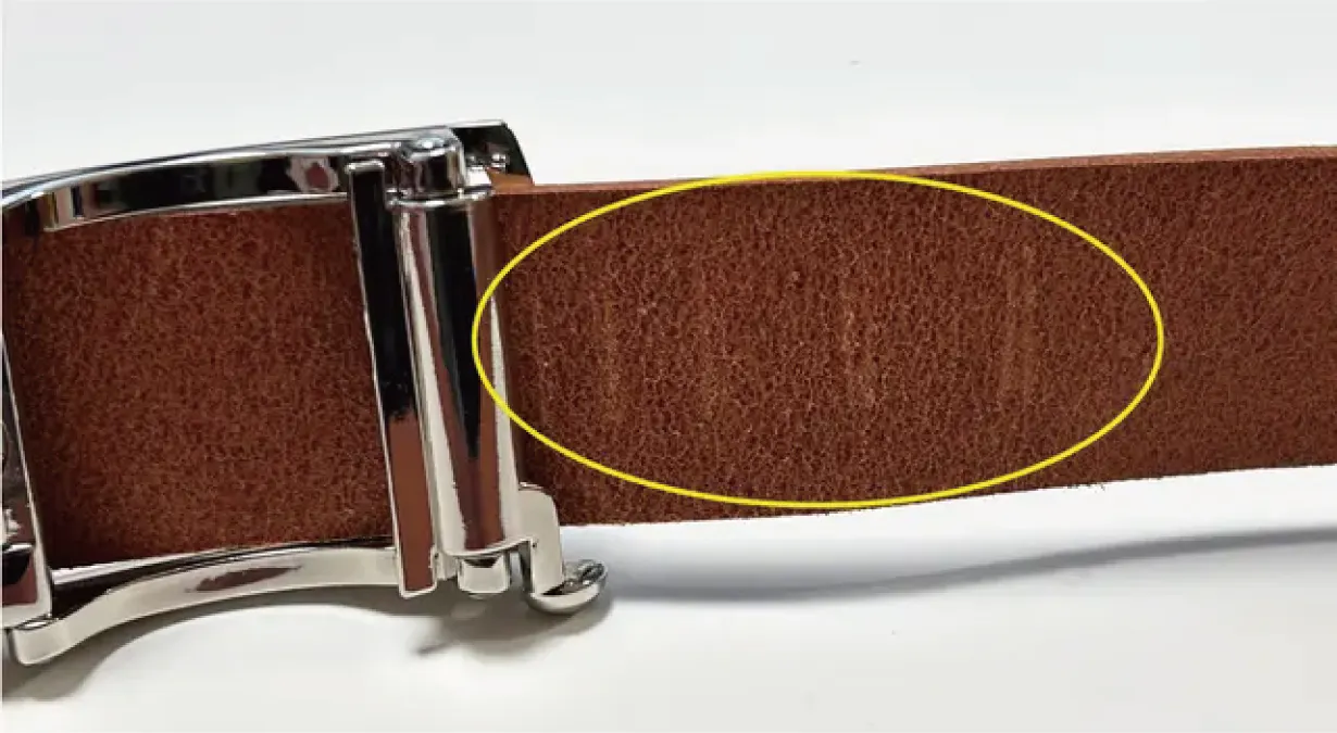 ベルトは使用頻度が高い商品なので、しっかりとした厚みをもたせ、セミアニリン仕上げをすることで高級感のある見た目と傷や水に対する強度を持ち合わせた革に仕上げています。