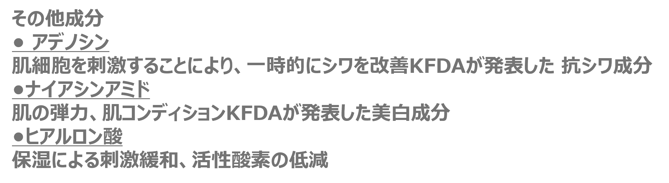 精製水、ダイプロピレングリコール、ナイアシンアミド、グリセリン、トラネキサミックアシッド、ペンチレングリコール、1,2-ヘキサンジオール、ソジウムハイアルロンネート、ヒドロキシアセトフェノン、ベタイン、パンテノール,オクチルドデセス-16,アデノシン,ダイソジウムイディティーエー,シトリックアシッド,ソジウムシレート,レシチン,エタノール,ハイドロライズドソジウムハイアルロネート,ポリエチル酸エチル酸塩酸エチルド,アセチレン,アセチレン,10-グルチド,アセチレン,アセトフェチド,、オリゴペプチド-12Kメチオニルエスエイチ-ポリペプチド-10、オリゴペプチド-12Kメチオニルエスエイチ-ポリペプチド-59、オリゴペプチド-12Kメチオニルエスエイチ-オリゴペプチド-2、香料