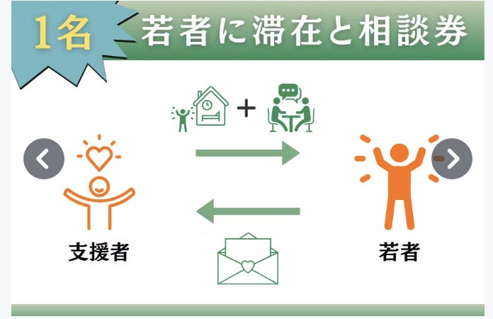 若者に1泊滞在と相談のチャンスを届けるリターンです。若者からは感想メッセージなどが届きます。