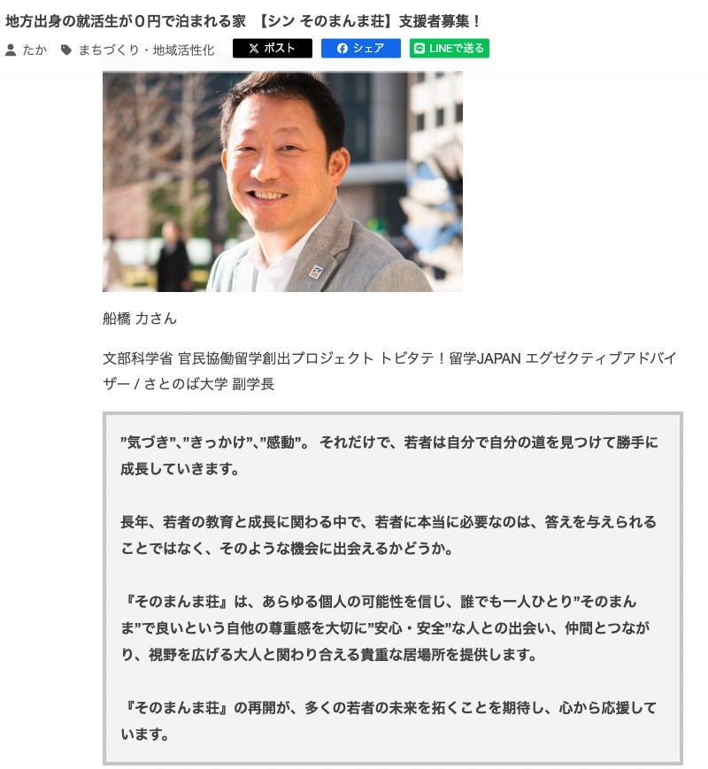 船橋さんにはクラウドファンディング本文に応援コメントも寄せていただいています。