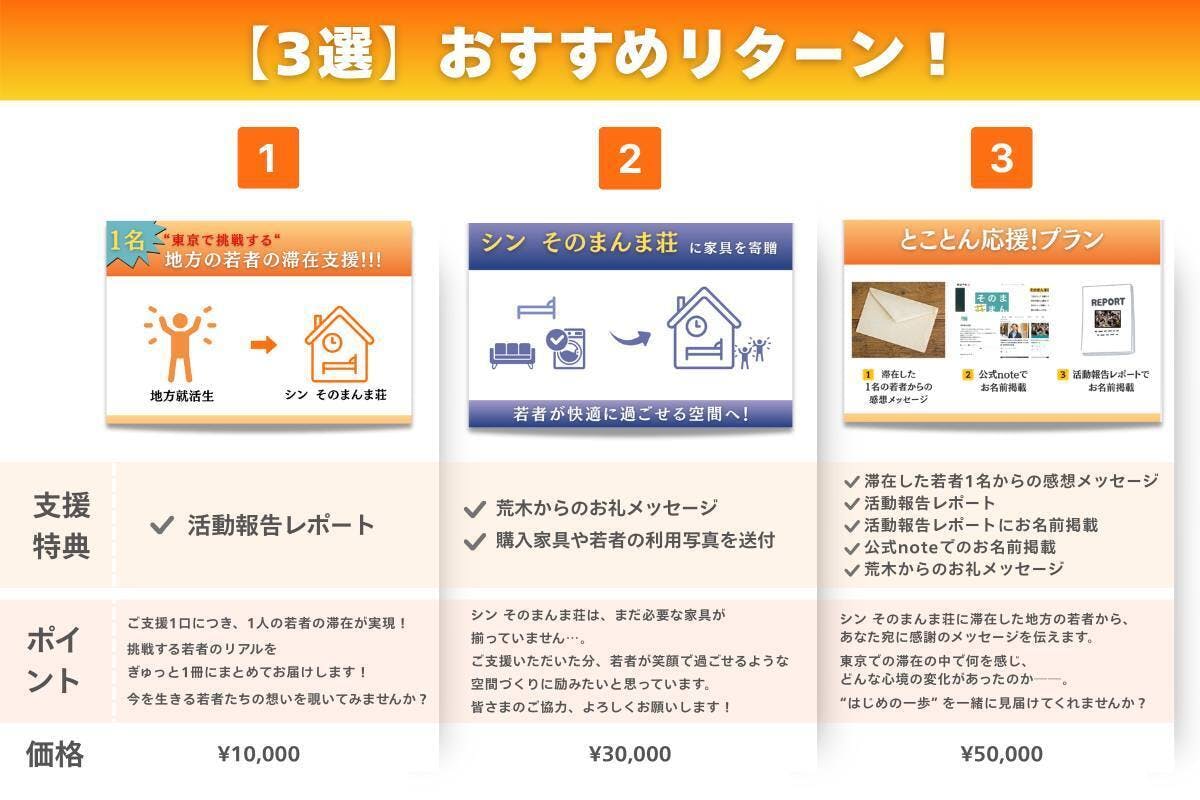 1名の若者が宿泊できるよう支援する枠や、若者が使う家具を送る枠、地方で若者を受け入れる地方枠など、さまざまな充実したリターンを準備しています。