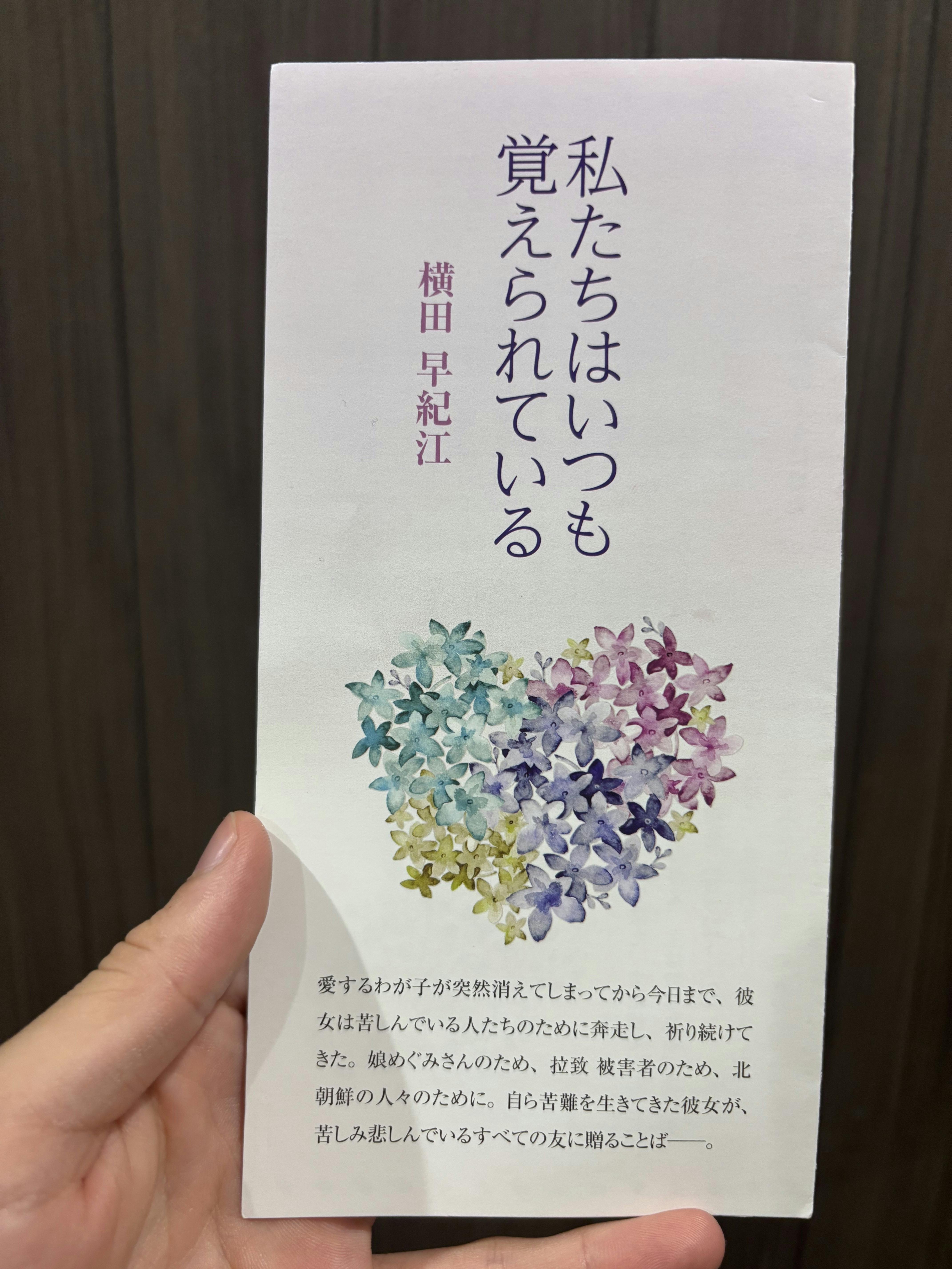そんな中で、今夜「最後の晩餐」で、たまたま相席になった香港の方からあるパンフレットを受け取りました。そこには、横田めぐみさんのお母様に関するお話が書かれており、非常に驚きました。というのも、香港の方々も横田めぐみさんの存在を知っており、そのことについて私に尋ねてくれたからです。