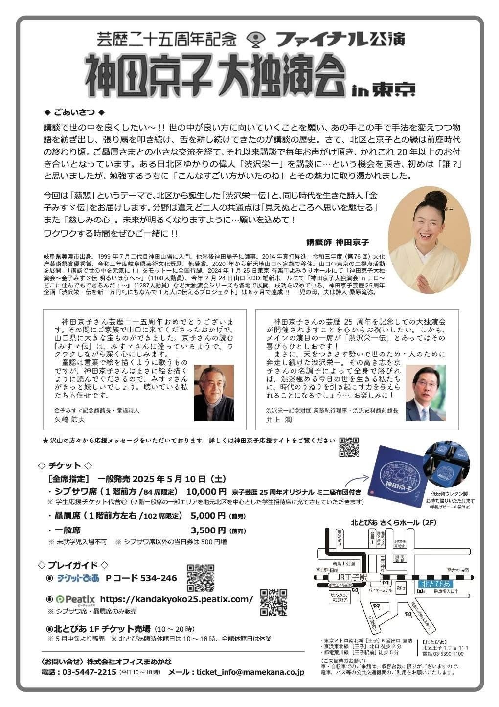7月6日(日)12時30分開場、13時開始、神田京子さんによる「渋沢栄一と金子みすゞ」の講談会。私も足を運びますので、もしタイミングの合う方がいたら、一緒に行きませんか?