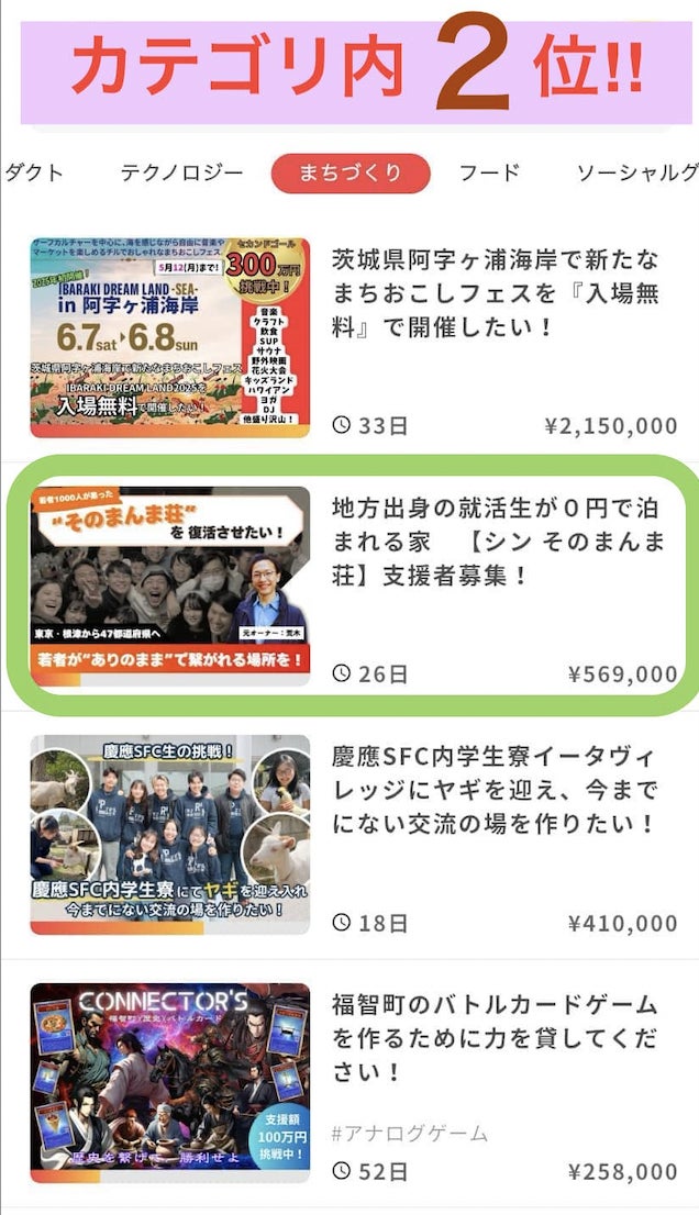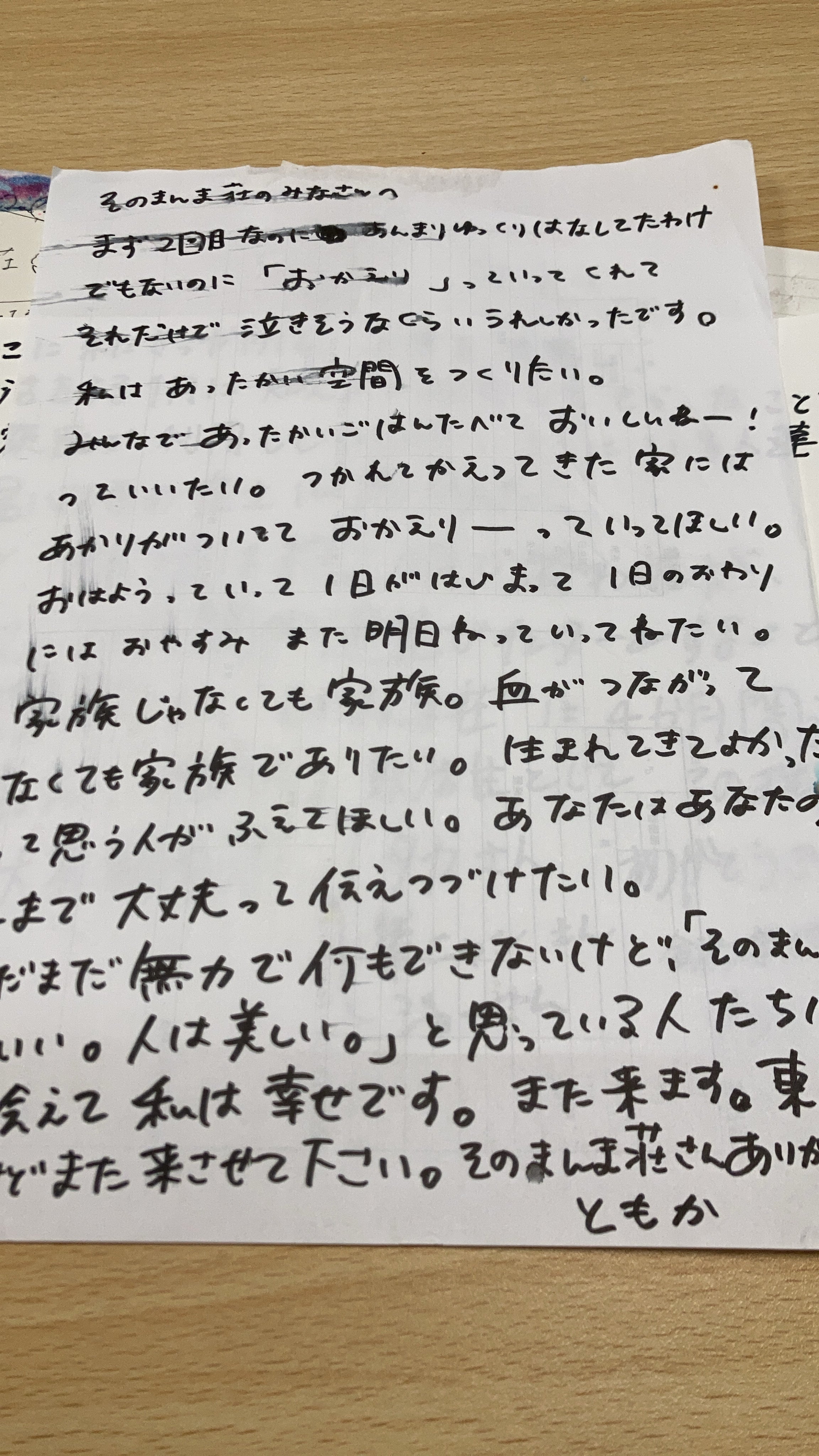 改めて、沢山のご支援と温かなメッセージやコメント本当にありがとうございます。プロジェクトを立ち上げてから、皆さんの声にずっと背中を押され続けています。皆さんのご支援を通して、若者が挑戦する「エネルギー」や「つながり」の受け皿が日々育まれていることを、肚の底から強く実感しています。今日は、原動力だった “【そのまんま荘】ユーザー” から届いた手紙の一部をご紹介させてください。「『おかえり』って言ってくれて、それだけで泣きそうなくらいうれしかったです。」「あたたかい空間をつくりたい。みんなでごはん食べて、おいしいねーって言いたい。」「血がつながってなくても家族でありたい。生まれてきてよかったって思える人が、増えてほしい。」「人は美しい、って思っている人たちがいてくれて、私は幸せです。」(一部抜粋)地方から来た若者にとって【おかえり。】と迎えてくれる意味に胸打たれました。初めて訪れる場所への不安感やドキドキ、大きなプレッシャーがある時に、優しさと繋がれることの価値に、きっと深く共感いただけたのではないでしょうか。地方から東京に来た学生たちにとって、そういった場所があるが、一体どれだけ心の励みになるかぜひ想像してみてほしいです。この場所は、ただの泊まる場所でも、イベントの場でもない。“挑戦する若者にとっての安心できる居場所”として、ちゃんと存在しているんだと改めて感じた手紙でした。難しいことじゃなくていい。ただ「おかえり」って言えること。ただ「一緒にごはん食べよう」って言えること。そんな、素直で、シンプルなつながりこそが、一番強く、今大切なのかもしれません。SNSでいつでもどこでも繋がりやすくなった現代社会だからこそ、なおさら。本クラウドファンディングを通して、応援してくれているみなさんと、このあたたかさを、そっと、でも確かに広げていけたらと思っています。次回の報告もどうか楽しみにしていてください。心からの感謝をこめて。