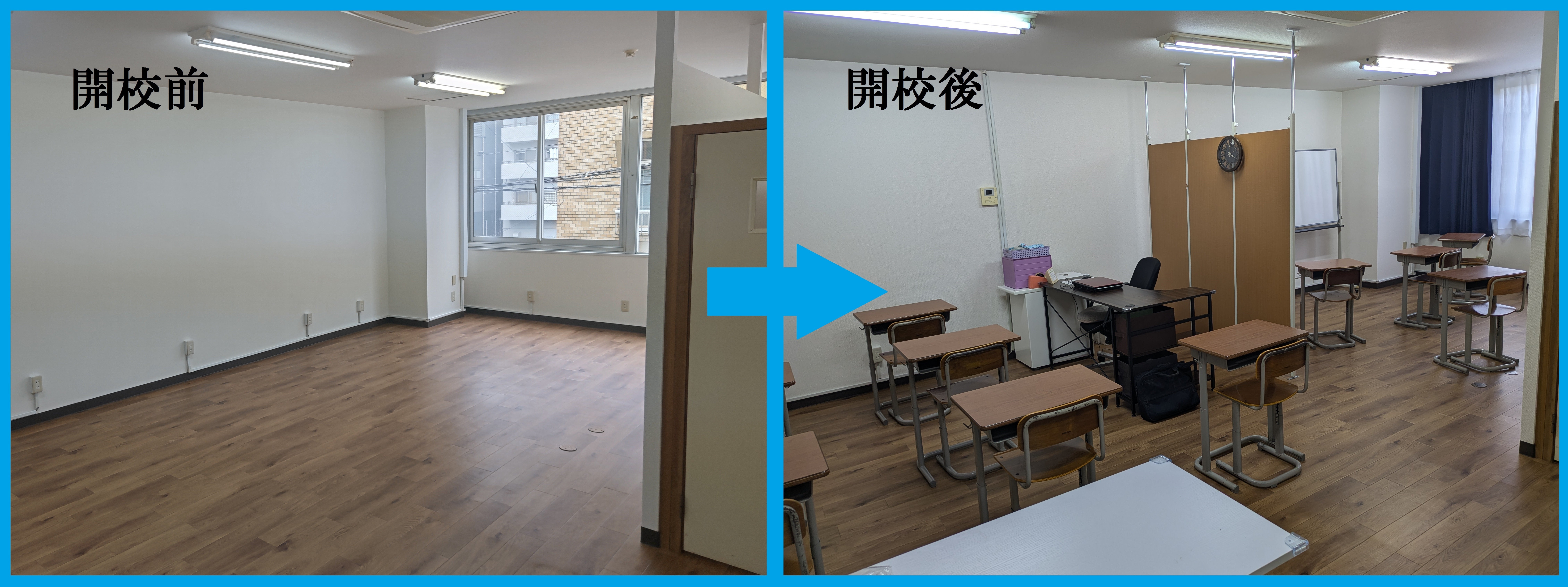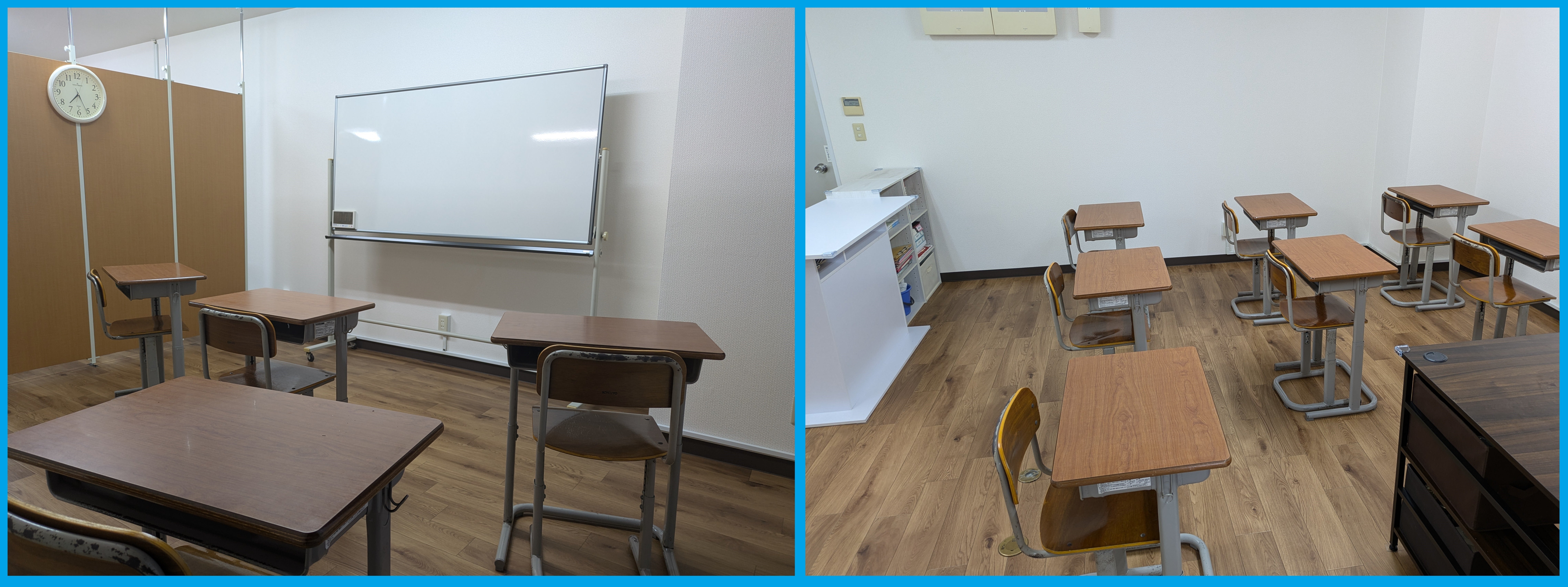 教室(左)と自学スペース(右)です。学校に近い雰囲気にしました。