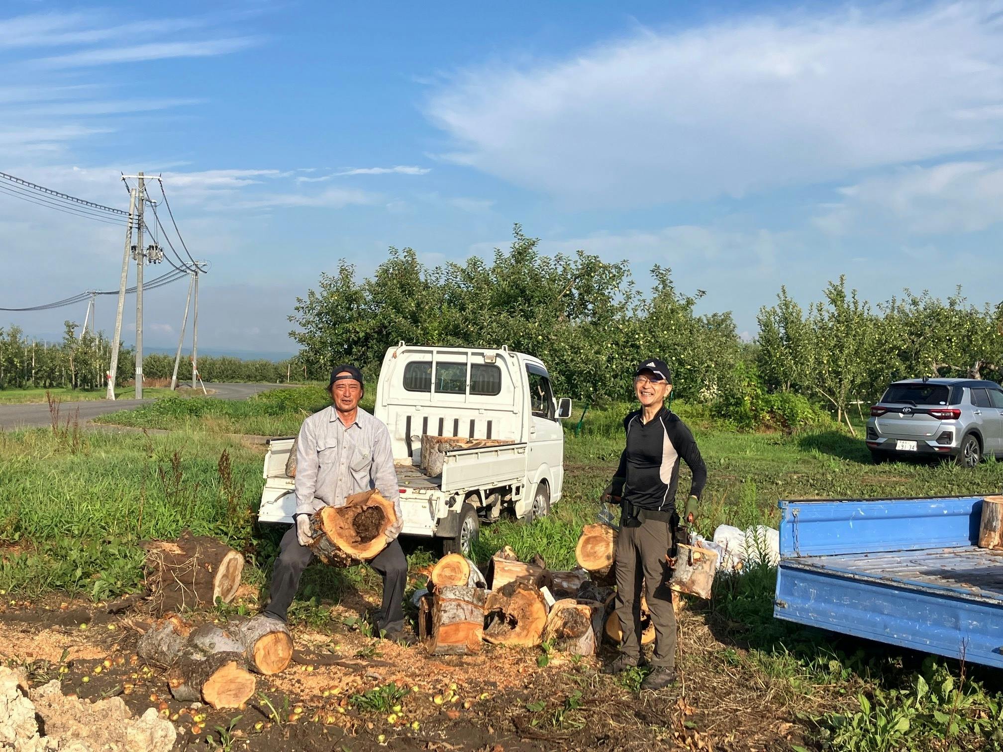 暑いので朝6時から始めました。来年の作業用のキャンプ用の薪です。