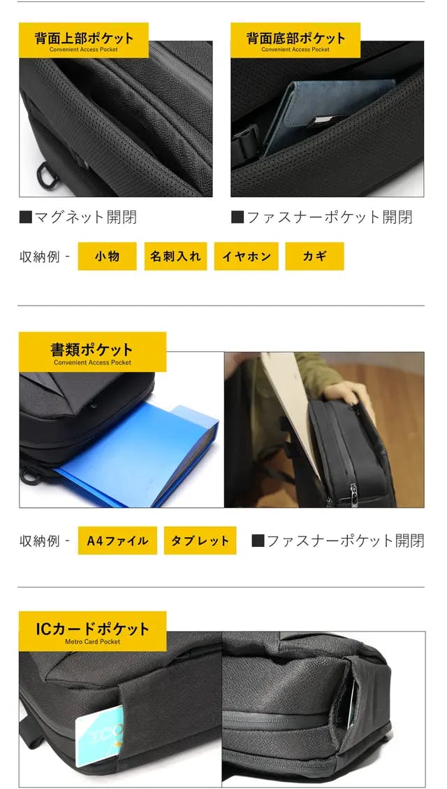 前面:ファスナーポケット×4(うち1つはハンドル収納兼用)、オープンポケット×1(ハンドル収納兼用)、ICカードポケット×1