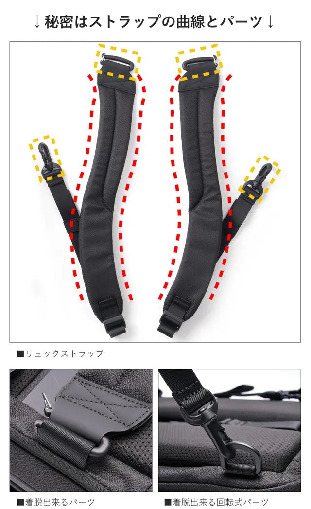 取付パーツと絶妙なリュックストラップの耐圧分散形状により、肩の形の個人差関係なくリュックがフィットする仕様を実現。