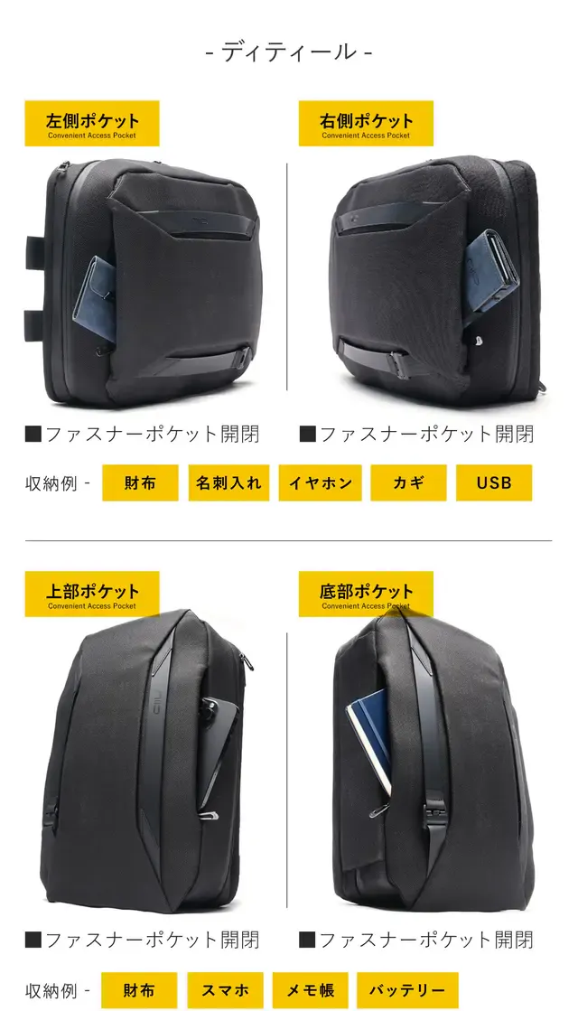 もう立ち止まらない!移動中に必要な荷物を片手で簡単にアクセス出来る5面ポケット。モノの定位置が決まることで、ガサゴソ探す必要がなくなり、使うほどに、あなたに馴染むバッグへ。