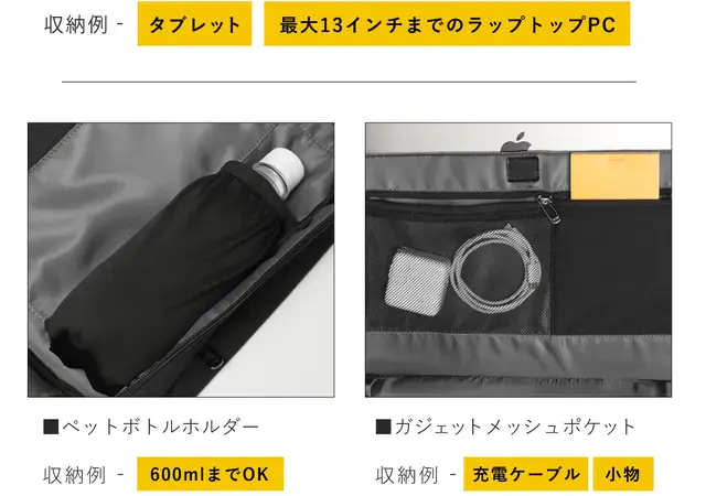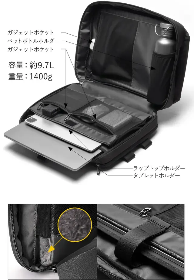 内側:ファスナーポケット×3、ペットボトルポケット×1、PCスリーブ×2