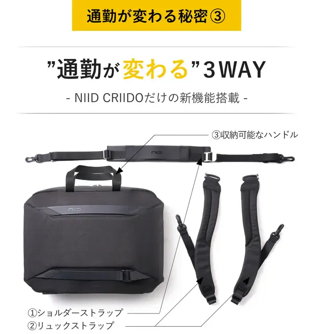 ブリーフバッグの「持つ」、ショルダーバッグの「肩に掛ける」、リュックの「背負う」の3つの使い方・スタイルがNIID CRIIDOで楽しめる。