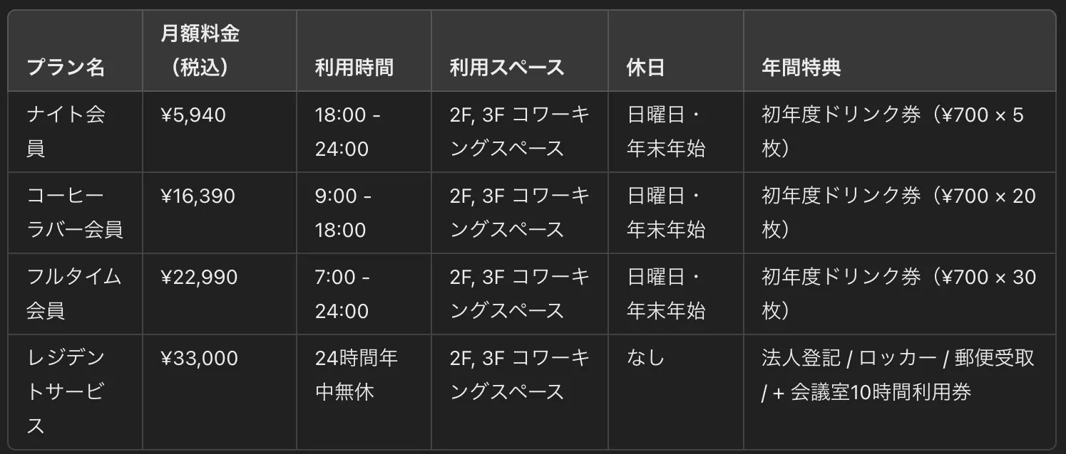 2025/03/14 14:56この度は、私たちのクラウドファンディングにご支援いただき、心より感謝申し上げます。ご案内の中で、各プランの休日・祝日についての記載が不足しており、ご迷惑をおかけしましたことを深くお詫び申し上げます。特に、日曜日および年末年始はお休みとなるプランがございますので、ご利用を検討される際にはご注意ください。以下の表が正式なプラン内容となりますので、ご確認いただけますと幸いです。日曜日・年末年始は、ナイト会員・コーヒーラバー会員・フルタイム会員の方はご利用いただけません。 レジデントサービスをご契約の方のみ、年中無休でのご利用が可能です。皆さまにはご不便をおかけしますが、何卒ご理解のほどよろしくお願いいたします。今後とも、どうぞよろしくお願いいたします。 もっと見る