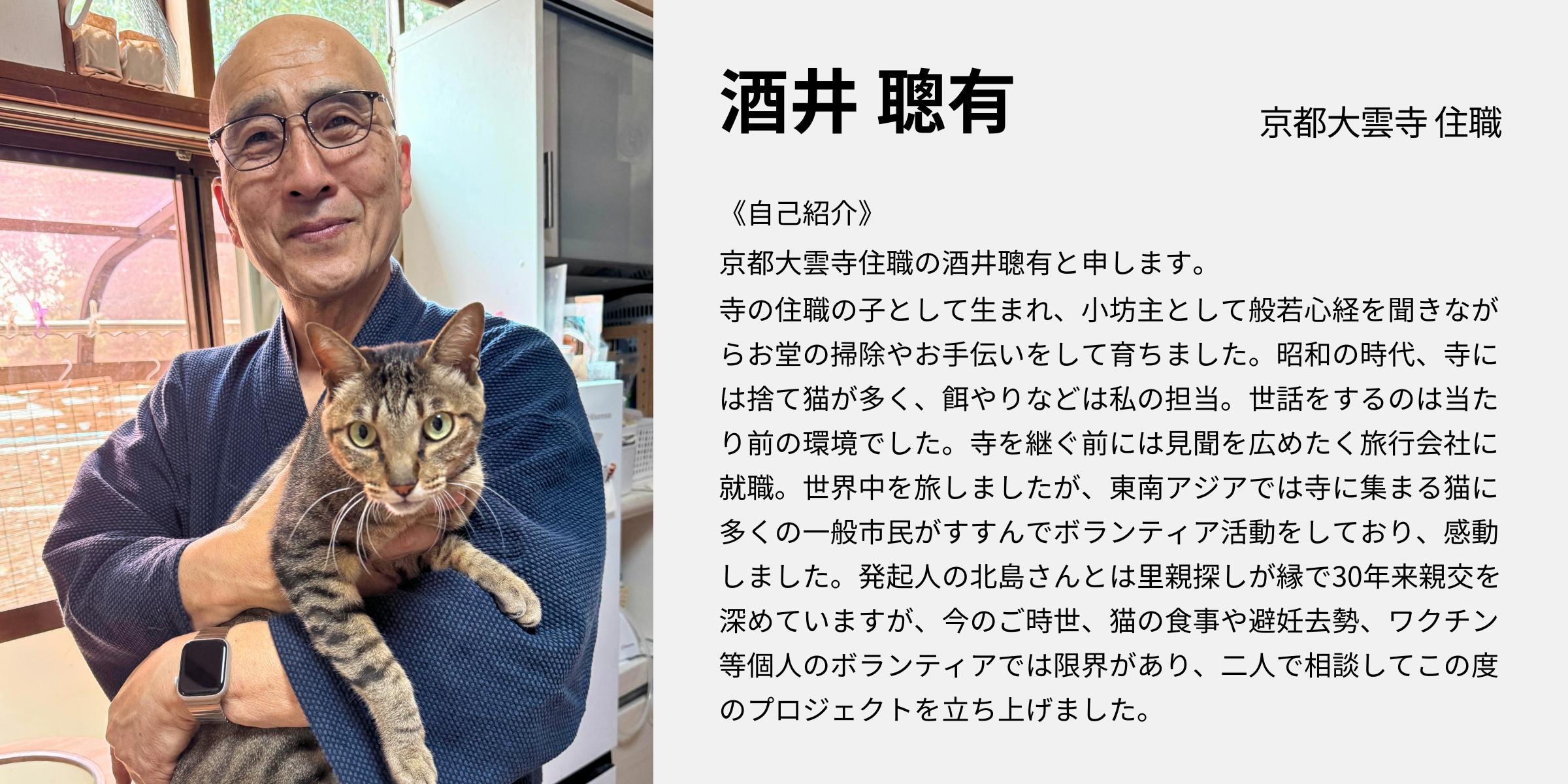そんな活動の中で出会った京都洛北大雲寺の酒井住職と共同で、保護猫活動のボランティア団体「一般社団法人ネコチュアリ」を昨年2024年10月に立ち上げました。個人での活動の限界(予算・時間・信用)を感じるなかで、私たちのおかれた環境で「私たちができること・私たちにしかできないことはなにか」を考えた末の行動でした。