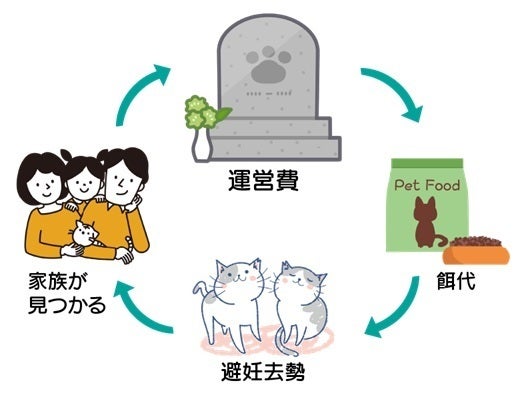 飼い主に寄り添いながら虹の橋を渡った愛猫の冥福を祈り、仲間に囲まれて寂しくならないねこ専用の葬儀・永代供養を執り行う。そして、その運営による収益で地域の保護猫活動(避妊・去勢手術の実施や里親探しなど)を加速させる。