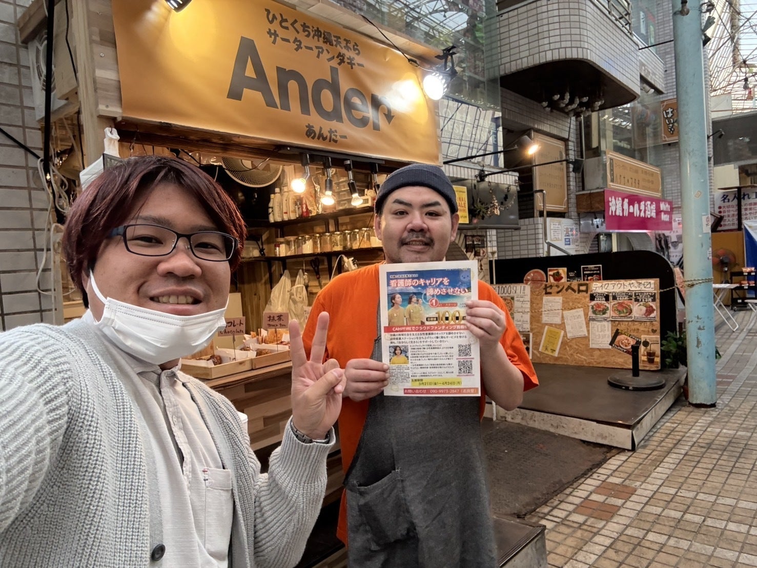 1stステージ到達に向けて、社員の気持ちも1つにまとまり、勢力的に躍動しています。2名のリーダーがチームをまとめあげ、リーダー自らも積極的に行動し、「自分にできること」を意識しながら笑顔と共に想いを届けて回っています。今回の写真は、リーダー野崎さん(ケアマネ×メタルコアバンドで活躍)が、知人である『ハイサイ探偵団の孫六さん』の運営する店舗 Ander(あんだー)平和通り商店街にある沖縄天ぷらとサーターアンダギーのお店https://www.instagram.com/ander_okinawa?igsh=djMxczljd2R4ZGg0100万円まで、6割まで到達しており、本当に本当に応援ありがとうございます。ご支援のメールが届くたびに、とても励まされながら、前に進む活力が湧き出てきます!!※らいふりぃインスタアカウントでも、活動報告をアップしていますのでチェックしてもらえると嬉しいですhttps://www.instagram.com/lifefree0615?igsh=MXc1MHJlcG9nbTVoOQ==引き続き、応援のほどよろしくお願いします。