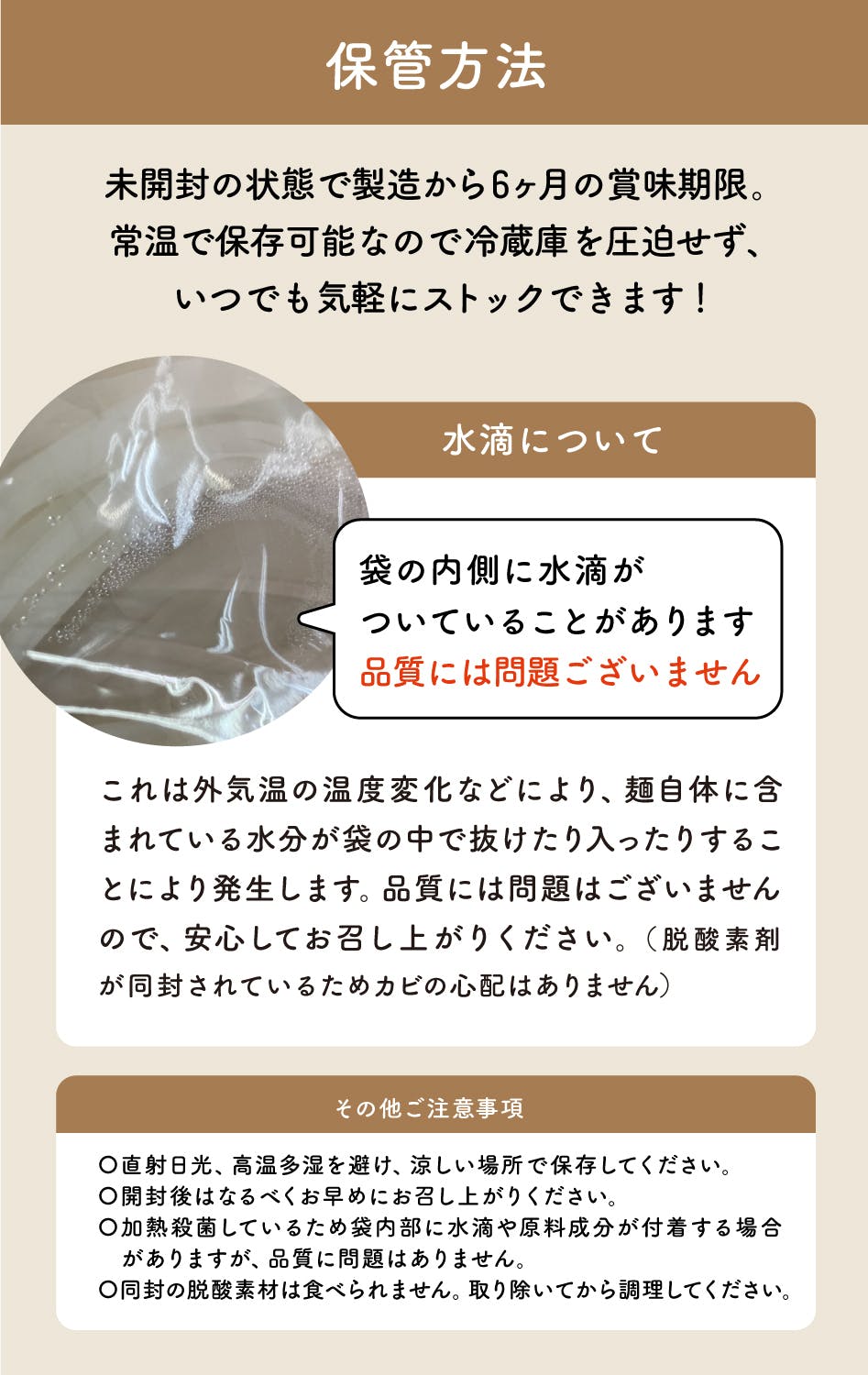 未開封の状態であれば常温で6か月間保存が可能ですので、冷蔵庫を圧迫することなく、安心してストックしていただけます。また、袋の内側に水滴がつく場合がありますが、これは温度変化などによって自然に発生するもので、品質には問題ございません。