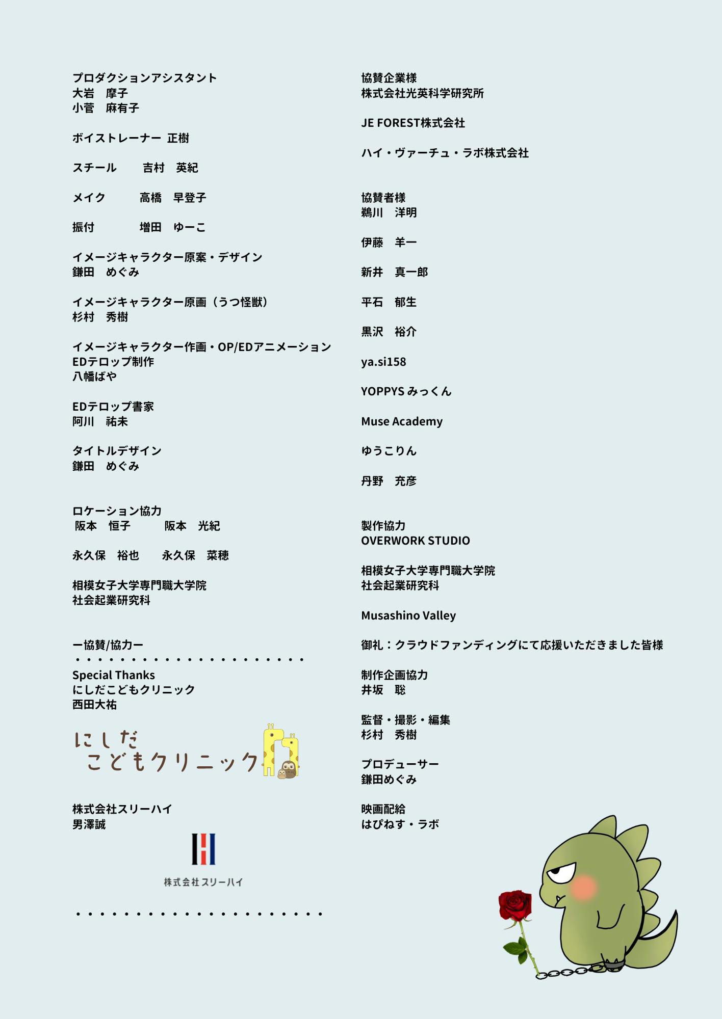 本作プロデューサーの私は映画制作の経験が全くありませんでしたが、それでも映画ができたのは私を支えていただいたみなさまのおかげです。
