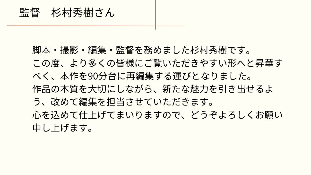 これは監督である杉村秀樹さんにより映像の再編集が行われます。監督 杉村秀樹さんからの応援メッセージ