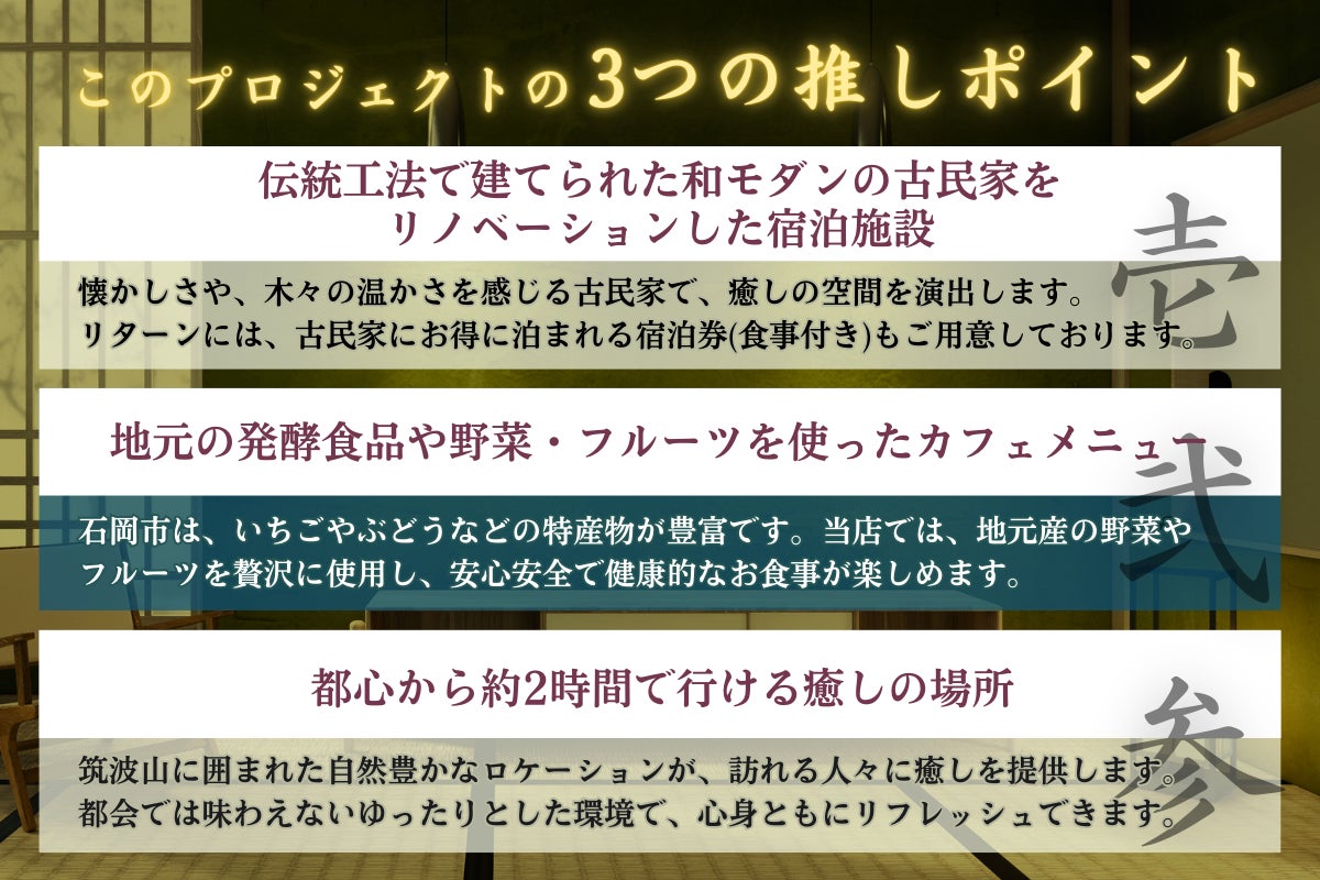 豊かな自然に囲まれた古民家で心身のリフレッシュを促すとともに、地元産の食材を使った健康的な料理を通じて、エネルギーチャージができる場所を作りたい、との思いから、今回のクラウドファンディングに挑戦することになりました。