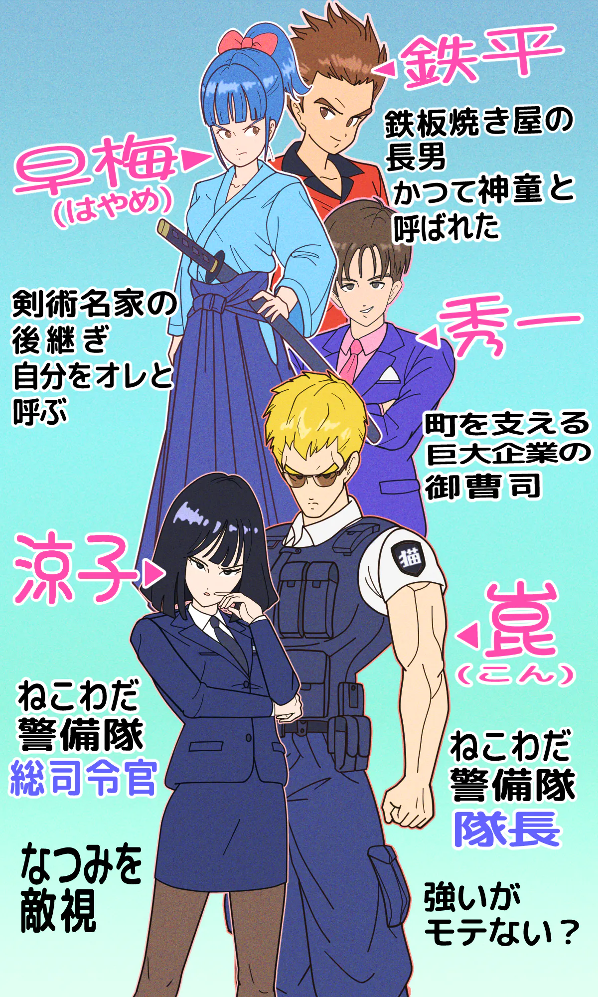 隊長の織春崑(おりはる こん)はあらゆる格闘技をマスターした不屈の精神の持ち主。男たちからの信頼は絶大だが、猫への過度な忠誠心や真面目さでクセが強い!その為女子からの人気はイマイチ…?(汗)