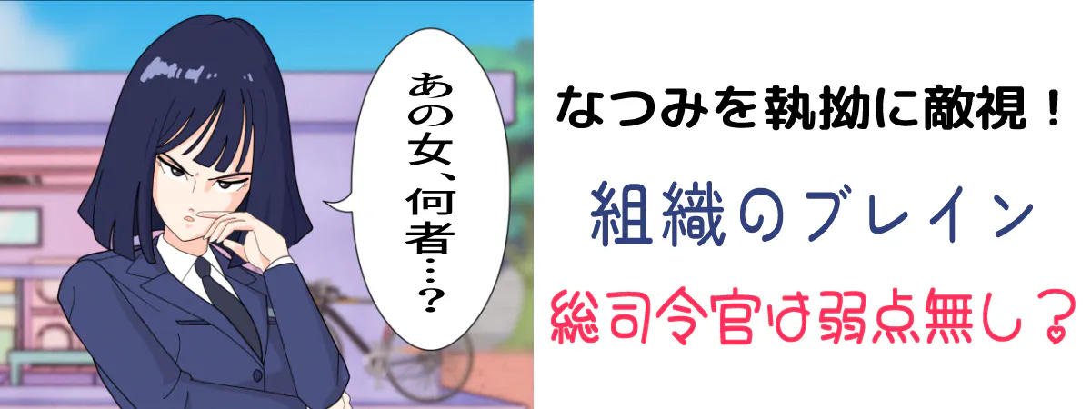 ▲組織のトップである涼子。なつみを怪しむ。町にやって来たなつみは、その美貌から注目の的となる!それを見た涼子は、「男たちを惑わし堕落させ、町の衰退を狙う魔性の女」と勝手に憶測しているよう…。だけど猫にはめっぽう甘い!