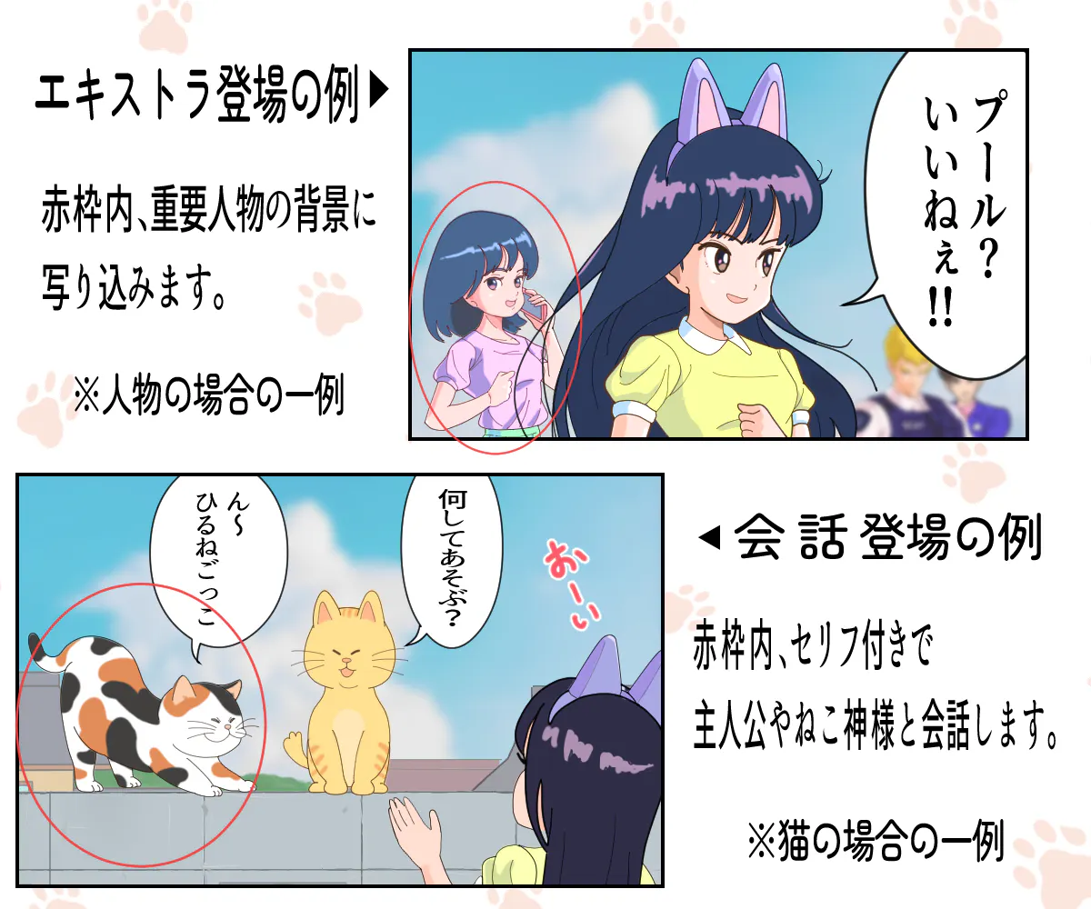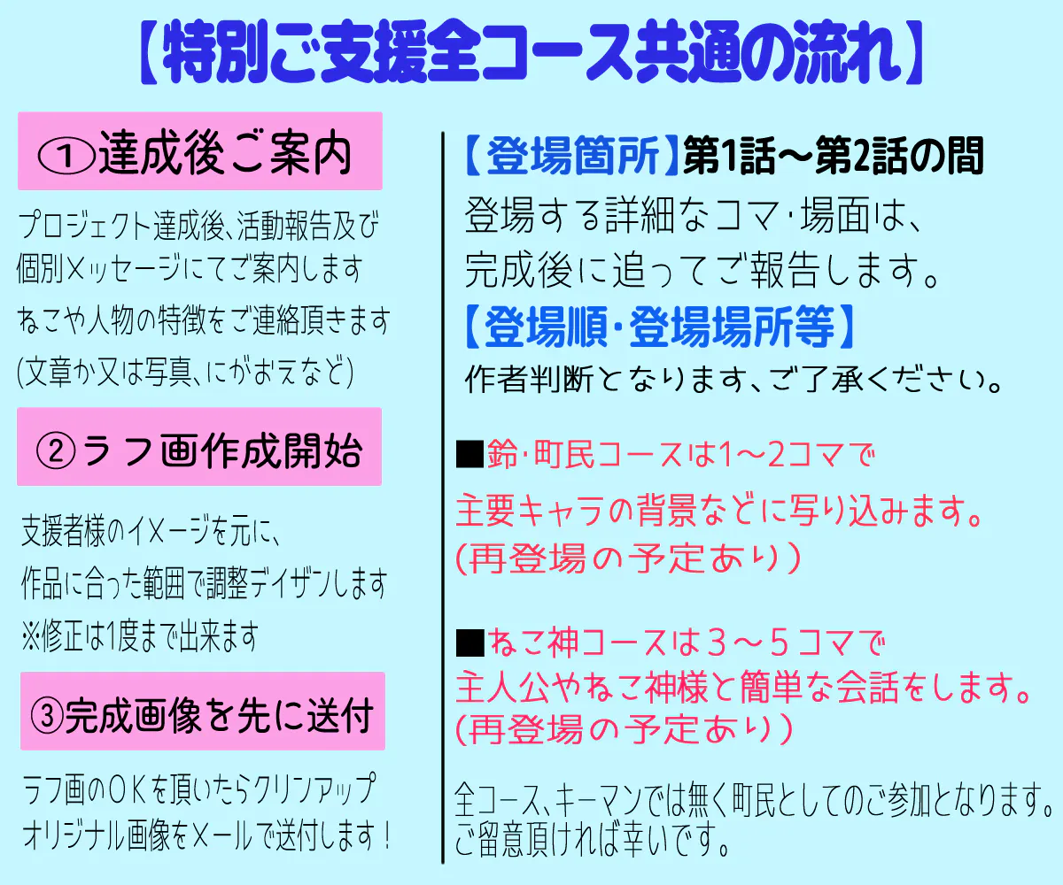 ねこ神コースのセリフ・会話内容は、物語に沿った内容で私の判断になります。セリフ・内容の指定は出来ませんのでご了承下さい。尚、「特別ご支援」でデイザンしたキャラクターは、プロジェクトオーナーの私に著作権が帰属される事をご留意くださいませ。