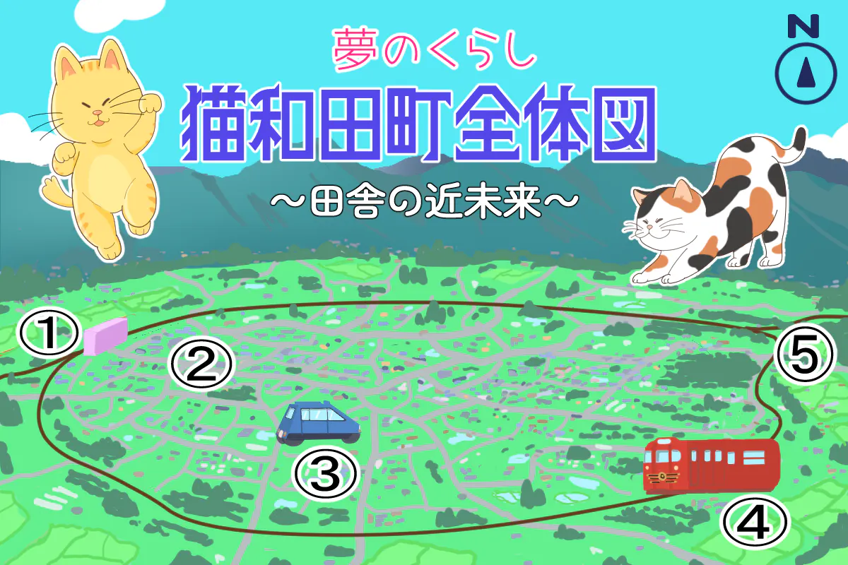 全体図③、④近未来的なインフラ技術 町中を最先端の無人タクシーが、その外周を電車が走る!タクシーは区間をループし、好きな所で乗降可!電車は走る度に電力を生産する夢の技術を搭載!乗客の有無に関わらず走行、赤字回避!最大時速30㎞で猫の町に相応しい速度設定!線路には特殊電波で小動物進入防止策!