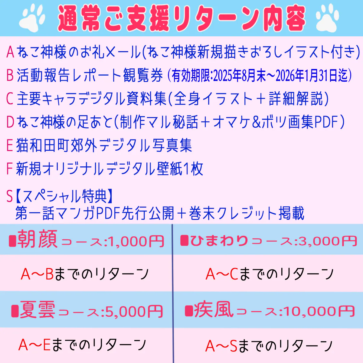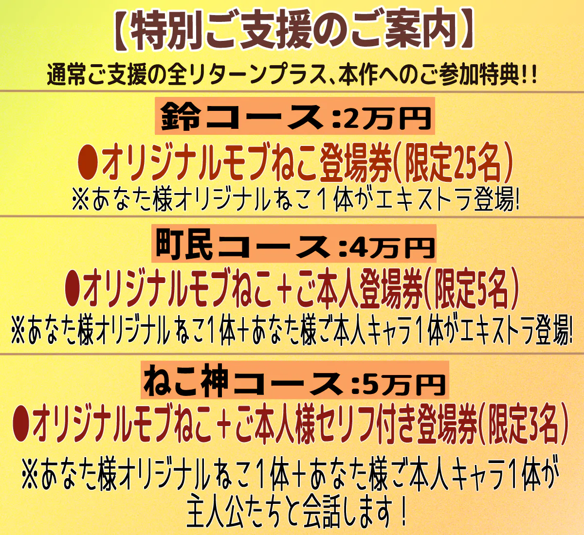 上記通常ご支援の全リターンのお受け取りに加え、本作へのご参加コースもご用意しています!「自分で考えたキャラクターがマンガに登場して欲しい!」「本作への参加度をより深めたい!」と感じて頂けた方向けの【特別ご支援】のご案内です!