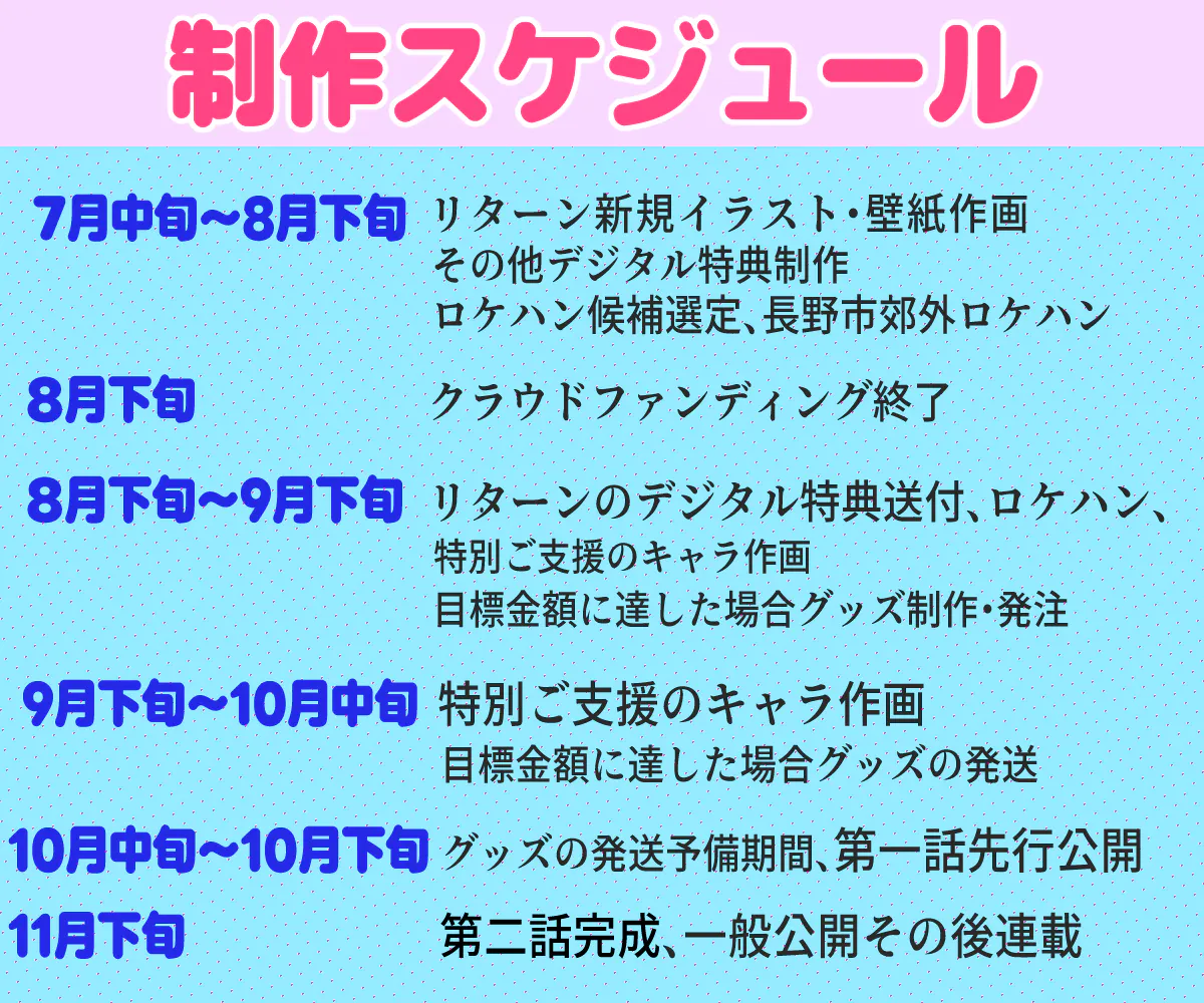 ▲個人で実現可能な無理の無い範囲で組みましたが、介護関係(ショートステイ先施設との日程の兼合い等)、ロケハン先の日程で若干遅延する場合もございます。その場合は活動報告にてお伝えしますので、進捗具合をご確認頂ければ非常にありがたいです!