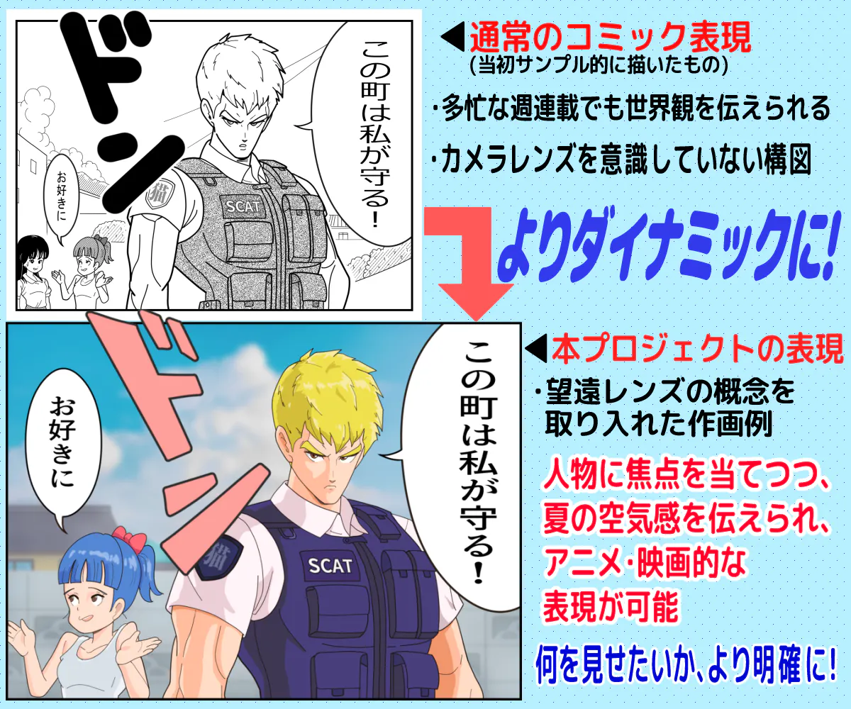 アニメ風に描くことで他作品と一線を画すと共に、読者の方に「これがアニメになったらなぁ!」と連想してもらえる様な話題性でメジャー化される事が最終ゴールです!